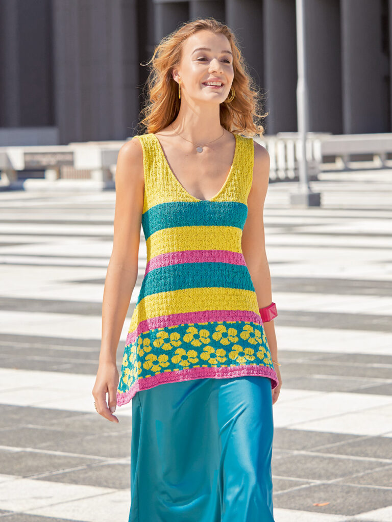 Dieses lange Top aus reiner Baumwolle hat das Potential zum Sommerstar zu werden. Ein tiefer V-Ausschnitt und die nach unten weit schwingende A-Linie sind perfekt für heiße Sommertage. Sattes Meeres-Türkis, sonniges Gelb, dazu einige pinkige Sonnenuntergangswölkchen – perfekt! Und als Highlight noch kleine, gelbe Sommerblümchen in Fair Isle eingestrickt. Das kleine Reliefmuster und die Farbwechsel sorgen für Abwechslung beim Stricken, nachdem das Blütenmuster erst einmal geschafft ist. Ein wenig Geduld ist hier bei Nadelstärke 3 allerdings schon gefragt, denn für die Blüten braucht es ein bisschen Übung. Dafür entschädigt der Spaßfaktor, die leuchtenden Blumen auf dem Smaragd-farbenen Hintergrund wachsen zu sehen. Tipp: wer die Rückreihen im Jacquardmuster scheut, kann das Top auch bis zum Beginn des Ausschnitts in Runden stricken. Einfach an den Seiten Maschenmarkierer setzen, um die Zunahmen für die A-Linie immer gut im Blick zu behalten.