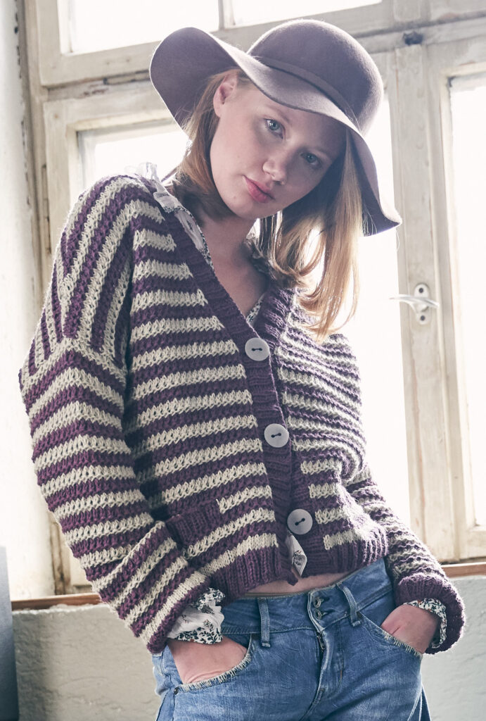 Der gestreifte Cardigan hat viele Details zu bieten: dezente Seitenschrägungen, betont überschnittene Schultern, eingearbeitete Taschen und passende Knöpfe – sie sieht sie aus, die neue Lässigkeit! Sowohl die Muster- als auch die Streifenfolge sind leicht zu merken und zusätzlich in der Anleitung detailliert Reihe für Reihe beschrieben. Das Querrippenmuster betont die Streifenfolge ganz besonders schön und ist mit einem Rapport von zwei Maschen und vier Reihen schnell verinnerlicht. Gestrickt wird alles in einzelnen Teilen und von unten nach oben. Bevor es an die Vorderteile geht, werden die Taschenbeutel gestrickt – so lassen sie sich ganz einfach direkt mit einarbeiten. So müssen zum Schluss nur noch die Taschen- und Vorderteilblenden angestrickt und alle Nähte geschlossen werden.