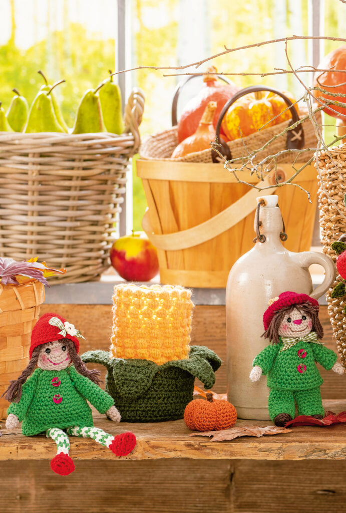 Das macht Lust auf den Herbst! Diese farbenfrohe Herbstdeko mit einem tollen Erntekranz mit gehäkelten Herbstfrüchten, wie Eicheln, Kürbissen sowie Sonnenblumen und weiteren Blüten, Zapfen und Blättern, einer umhäkelten LED-Kerze in Maisoptik und superniedlichen Figuren, Wichtelmädchen und Vogelscheuche, lässt sich dank der ausführlichen Häkelanleitungen auch von etwas ungeübteren Häklerinnen problemlos nacharbeiten. Der umhäkelte Styropor-Ring präsentiert die bunten Früchte der Erntezeit. Eine schöne Szene in warmen Herbstfarben bildet die lustige Vogelscheuche mit Kürbis neben der Mais-Kerze.