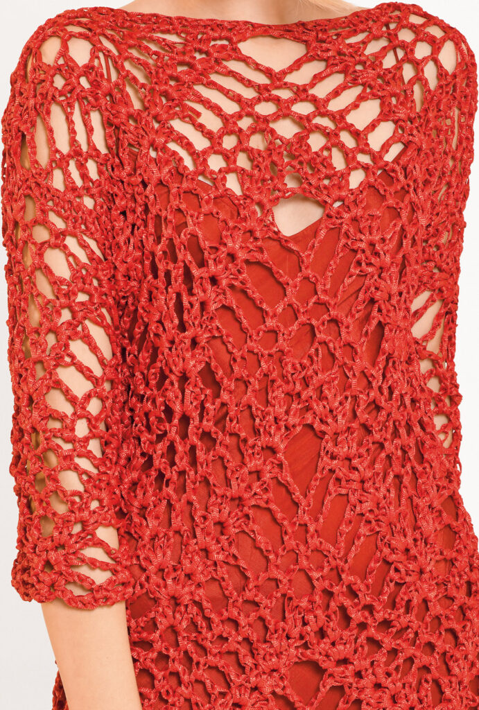 Häkeltrends Gehäkelter, langer Pulli mit 3/4 langen Ärmeln in Rot