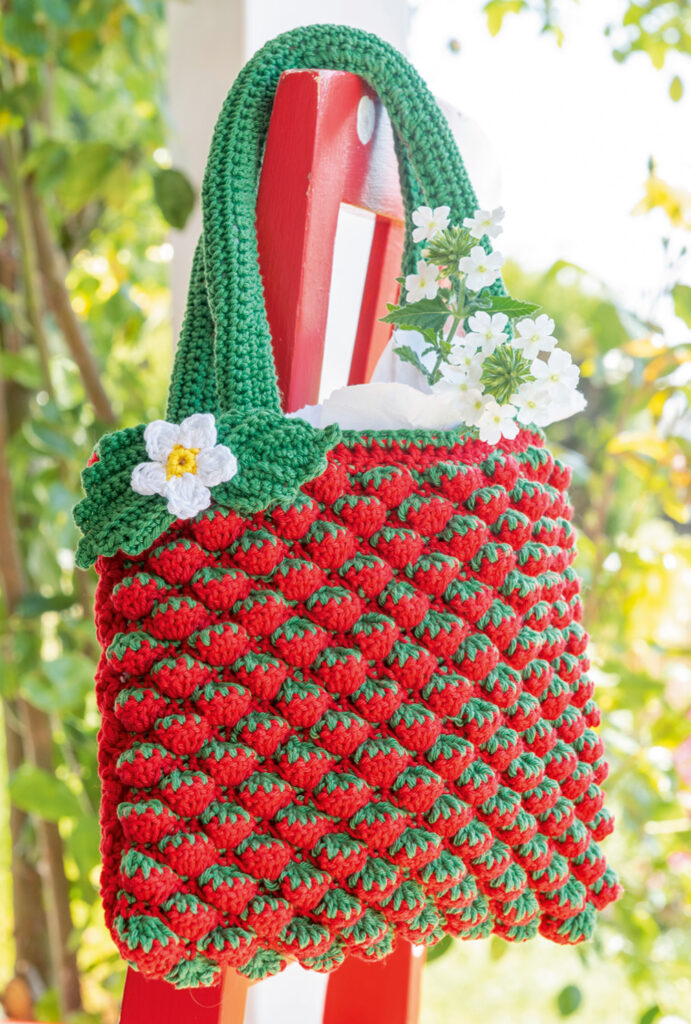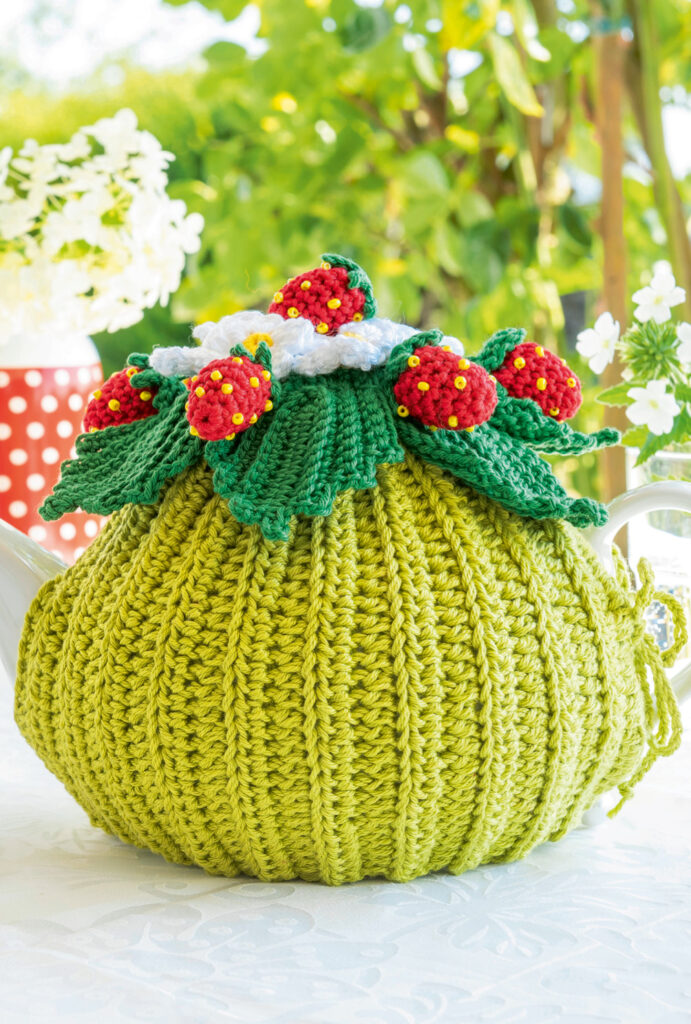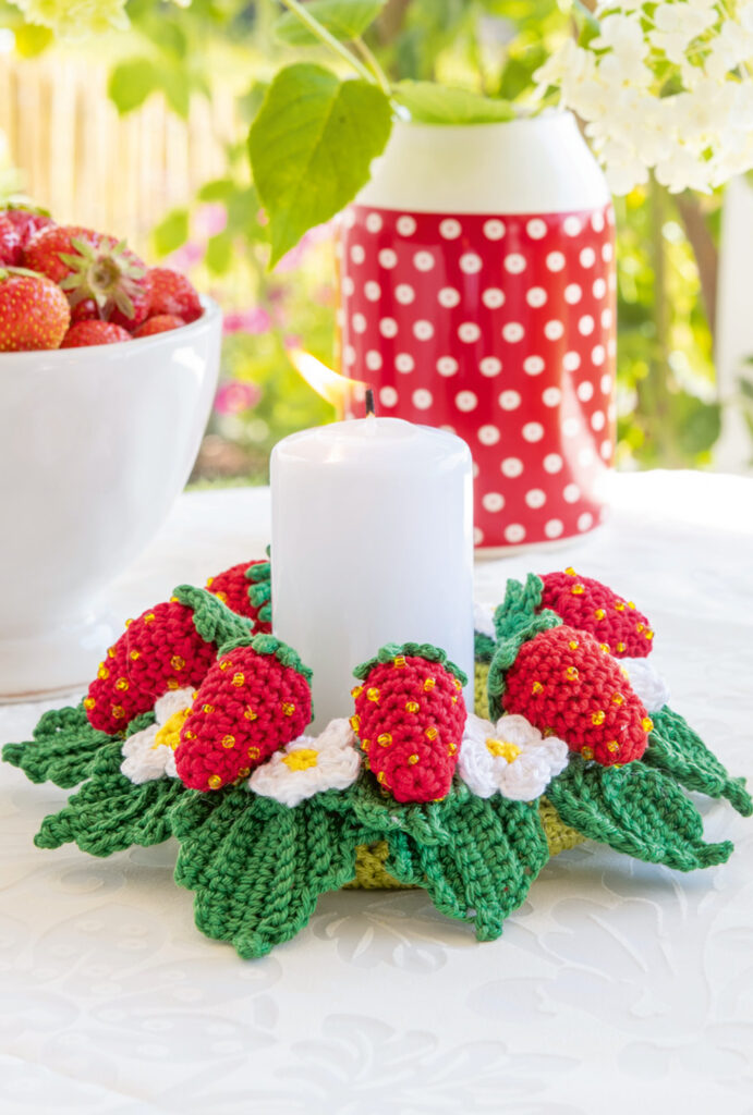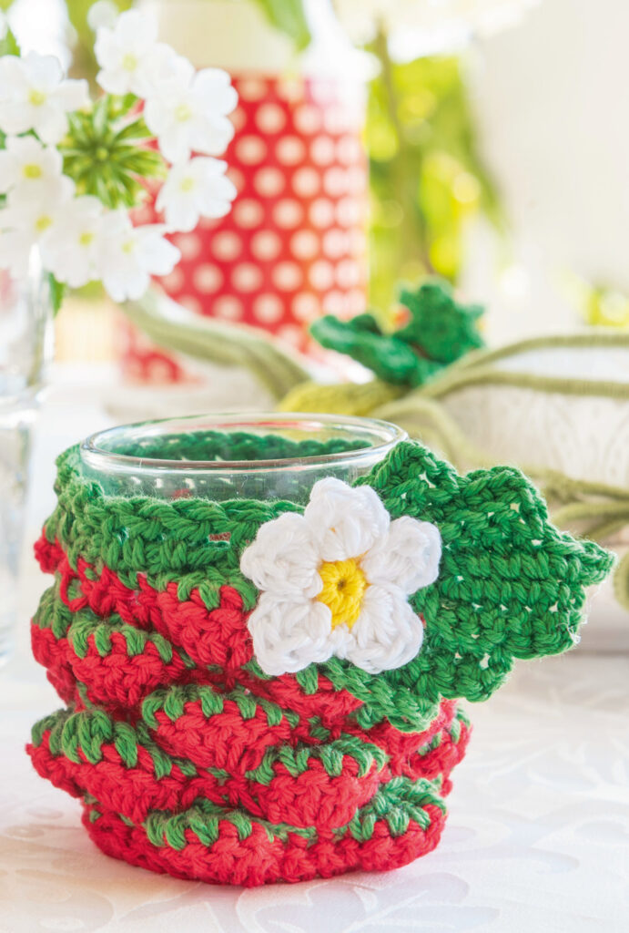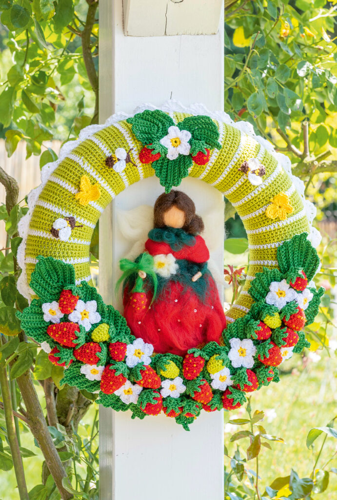 Eierwärmer: ca 4,5 cm hoch; Serviettenringe: ca 5,5 cm Ø; Windlichter: ca 5,5 cm Ø, 6,5 cm hoch; Kannenwärmer und Türkranz: ca 35 cm Ø; Tasche: ca 22 x 18 cm (ohne Henkel)