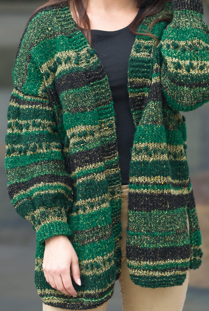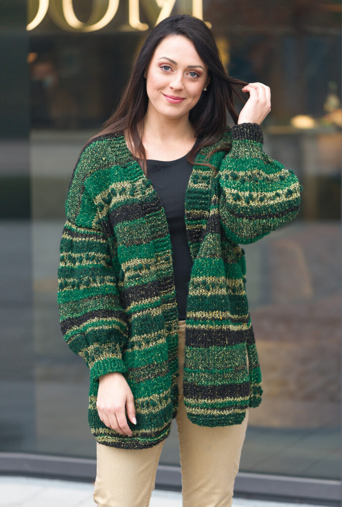 Mit diesem selbstgestrickten Cardigan kannst du nichts falsch machen. Einfach gestrickt mit Rippenmuster und Kraus-Rechts sowie Glatt-Rechts geht er leicht von der Hand und ist recht schnell fertiggestellt. Das gewählte Garn sorgt für spannende Strukturen und ein abwechslungsreiches Streifenmuster mit Textur. Auch für Strickanfänger ist dieses Modell super geeignet, da mit recht wenig Vorkenntnissen und wenigen Strickmustern hier ein effektvolles Lieblingsstück entsteht, das dich den ganzen Herbst und Winter über begleiten kann.