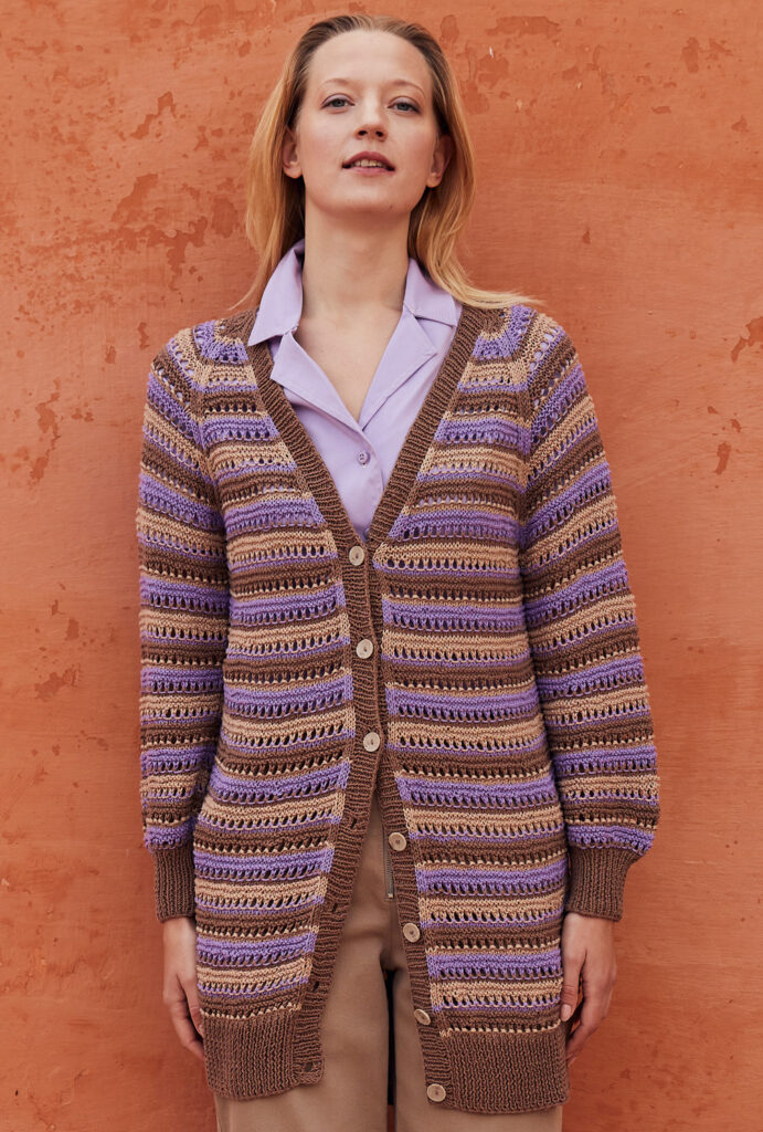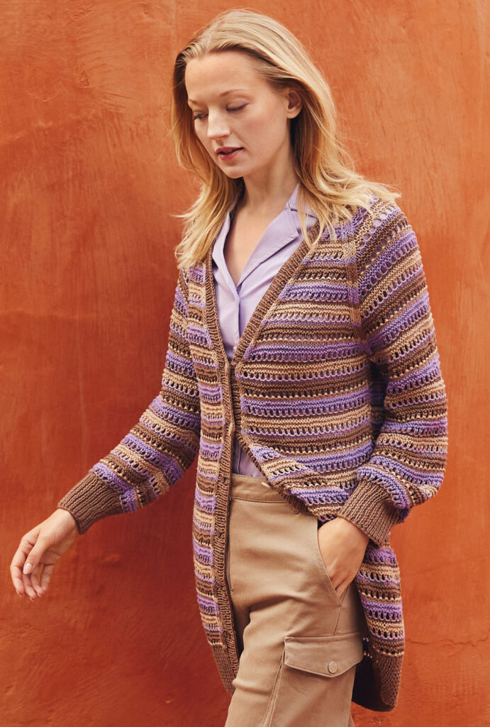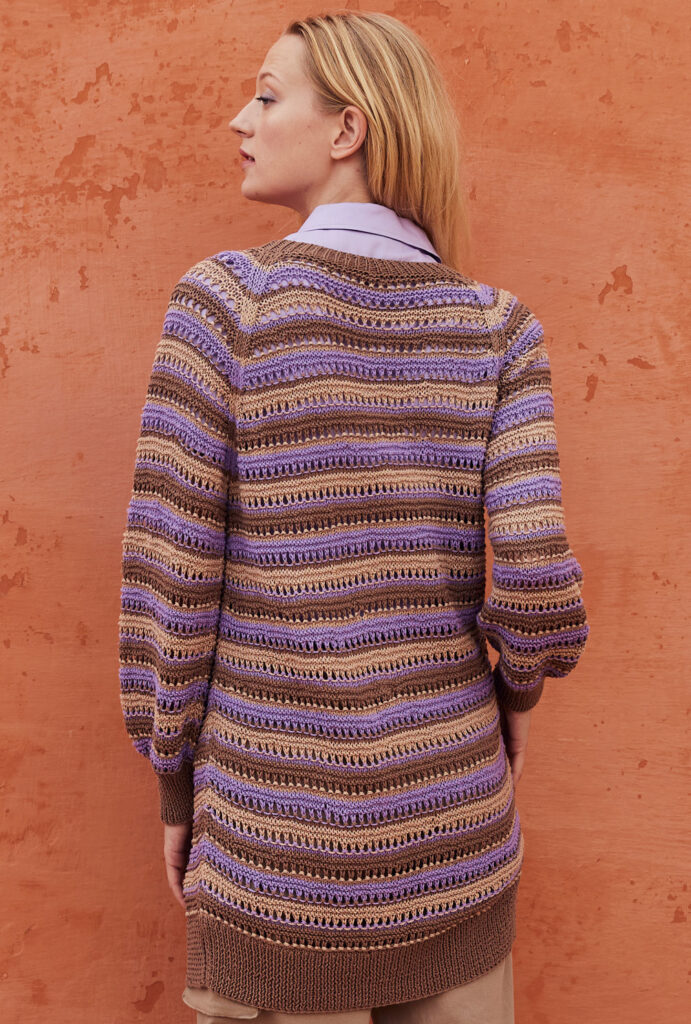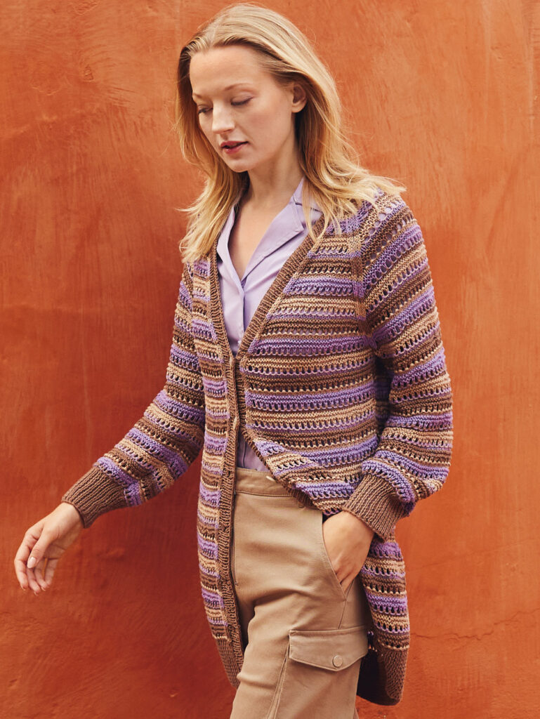Schmal und hüftlang: Diese Longjacke aus Bio-Baumwolle macht im Frühling immer eine gute Figur. Das einfach zu strickende Streifenspiel mit Lochreihen lässt die Teile Stück für Stück wachsen und sorgt für Abwechslung. Du beendest die Arbeit mit einer gleichmäßigem Raglanschrägung, die zusätzlich durch schmale Glatt-rechts-Streifen akzentuiert wird. Zum Schluss noch die Verschlussblende anstricken und mit passenden Knöpfen ergänzen – fertig ist ein toller Begleiter, der lange deine Garderobe vervollständigt.
