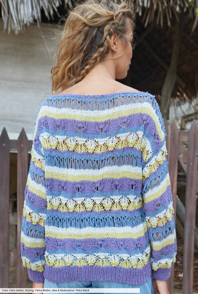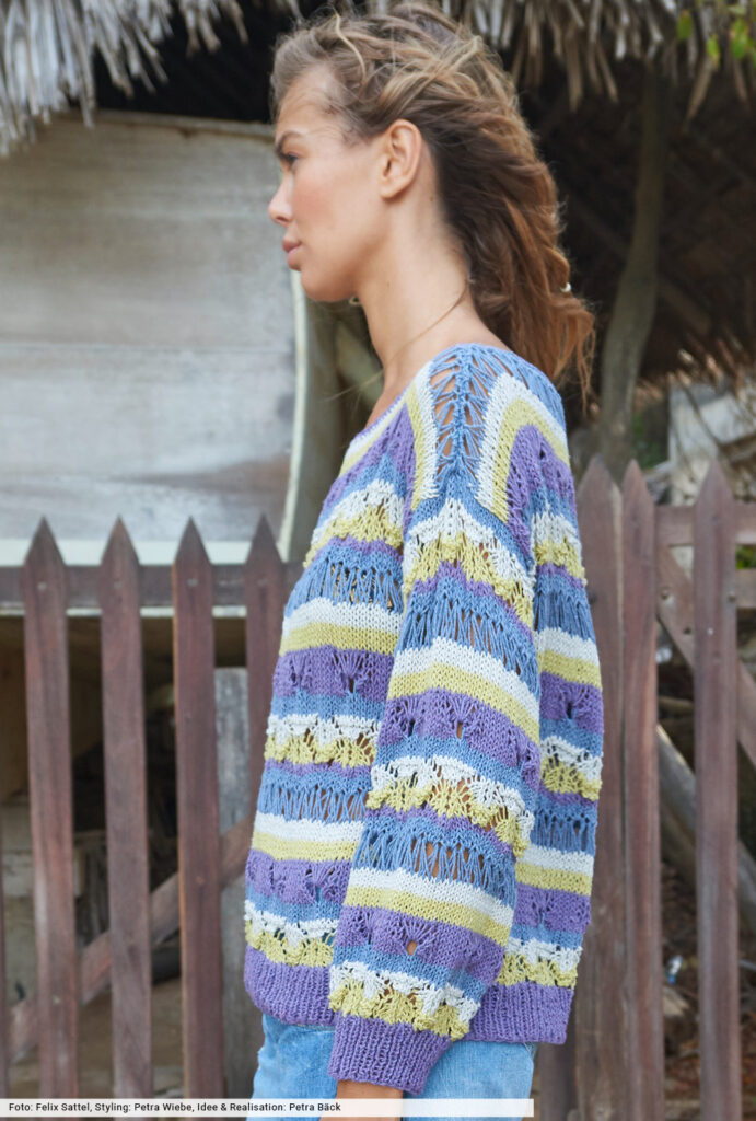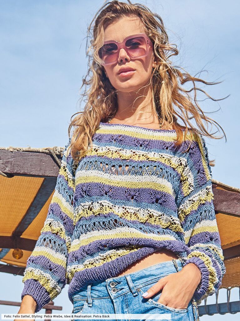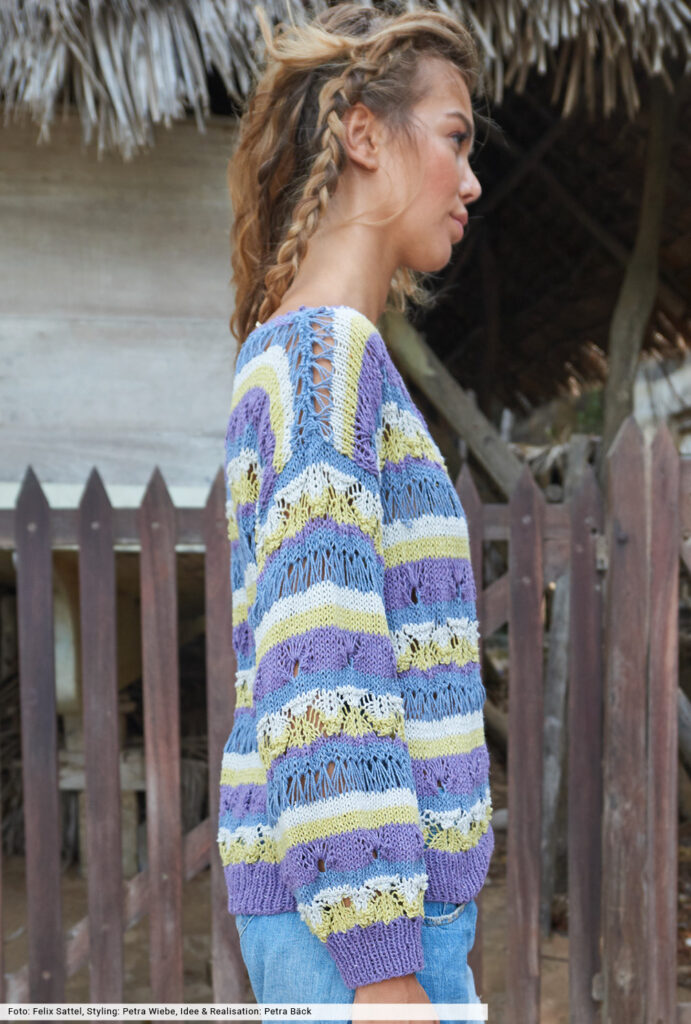 Streifen aus Fall- und tiefgestochenen Maschen, dazu ein fantasievolles Ajourmuster und alles mit vier Farben kombiniert – so entstehen Pullis, die nicht nur innovativ sind, sondern bei denen es dir während des Strickens auch nicht langweilig wird. Wir haben bei diesem lässigen Trendsetter auch auf die Auswahl des Garnes geachtet: Es wird aus wiederverarbeiteten Jeansfasern gewonnen – ein echtes Statement für Nachhaltigkeit und Umweltbewusstsein.