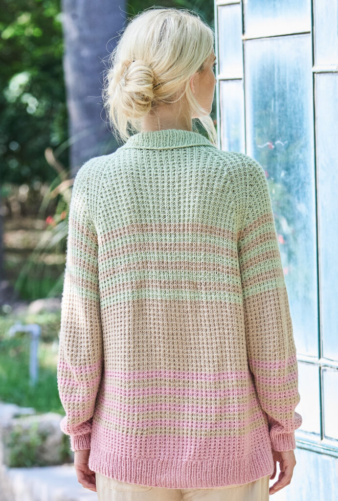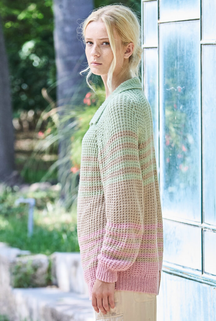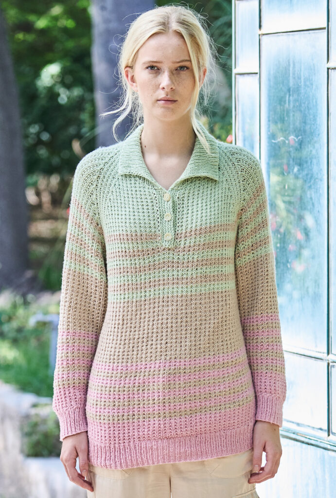 Hier ein aparter Pulli, der einerseits durch sein freundliches und harmonisches Streifenspiel für die feminine Note sorgt und andererseits durch Raglanschnitt und Polokragen den sportiven Touch vermittelt. Das leicht aufgeraute Baumwollgarn bildet die Grundlage und lässt die einfachen Rippenstrukturen aus rechten und linken Maschen toll zur Geltung kommen. Aufpassen musst Du bei der Raglanpasse, die in einem Stück gestrickt wird – das ist in unserer Anleitung aber genau beschrieben. Dann fehlt nur noch die Poloblende, der Kragen und die Knopflöcher, die das vitale Finish bilden.