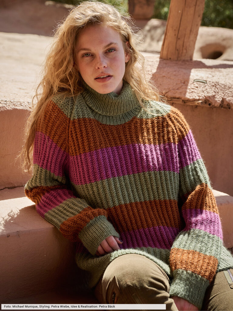 Herbsttöne wie Zimt, Beere oder Waldgrün bringen Wärme in jedes Outfit. Hier lassen diese drei Farben streifenweise einen lässigen Pulli entstehen, dessen Raglanschrägungen durch raffinierte Abnahmen akzentuiert werden. Die Rippenstrukturen heißen übrigens «falsches Patent» und entstehen aus rechten Maschen, die mit abgehobenen Maschen kombiniert werden. Dies wird in unserer Anleitung genau beschrieben, sodass nach der Fertigstellung deine Garderobe mit einem weiteren Lieblingsmodell vervollständigt wird.