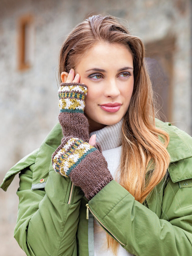 Anna Handarbeiten Gestrickte Handschuhe mit Fair-Isle-Muster in Beige-Braun-Grün