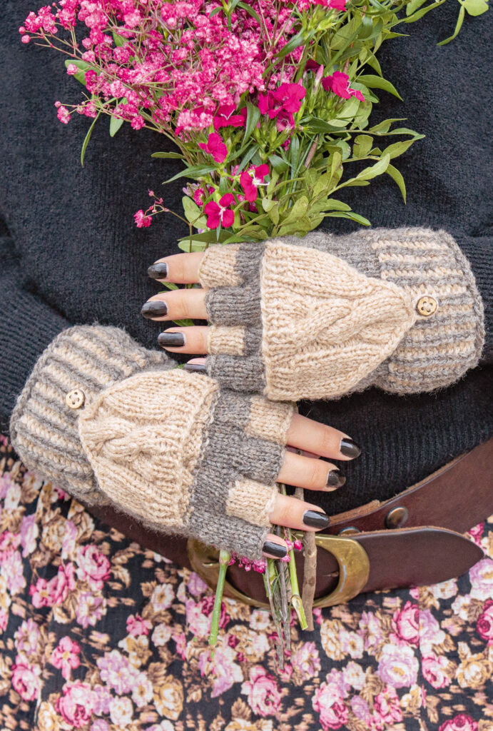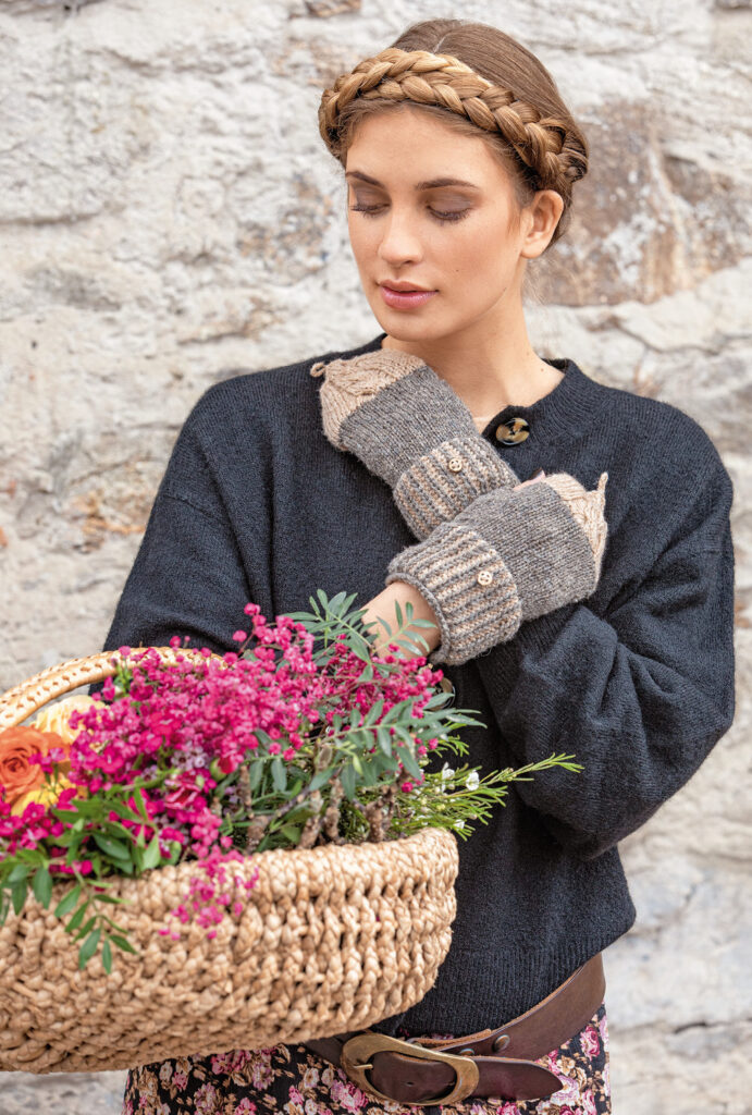 Handschuhe! Die hier vorgestellten sind eine besonders edle Variante fingerloser Handschuhe und Fäustlinge in Einem: Werden die Finger zu kalt, können die Marktfrauen-Handschuhe ganz einfach mithilfe je eines Knopfes mit der Fingerkappe geschlossen werden. Diese wunderschönen Handwärmer werden mit der «Cuor di Merino 210“ von Gedifra u.a. im Rippenmuster und im zweifarbigen Halbpatentmuster gestrickt. Dank der ausführlichen Strickanleitung inklusive Strickschrift ist das auch für etwas ungeübtere Strickerinnen kein Problem.