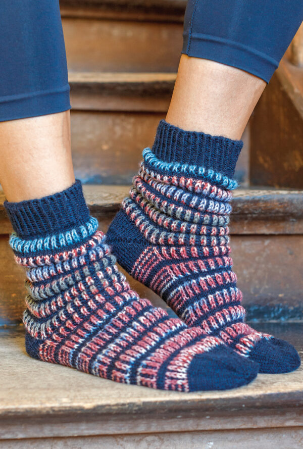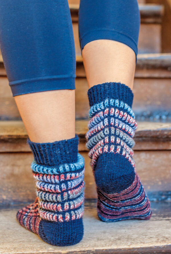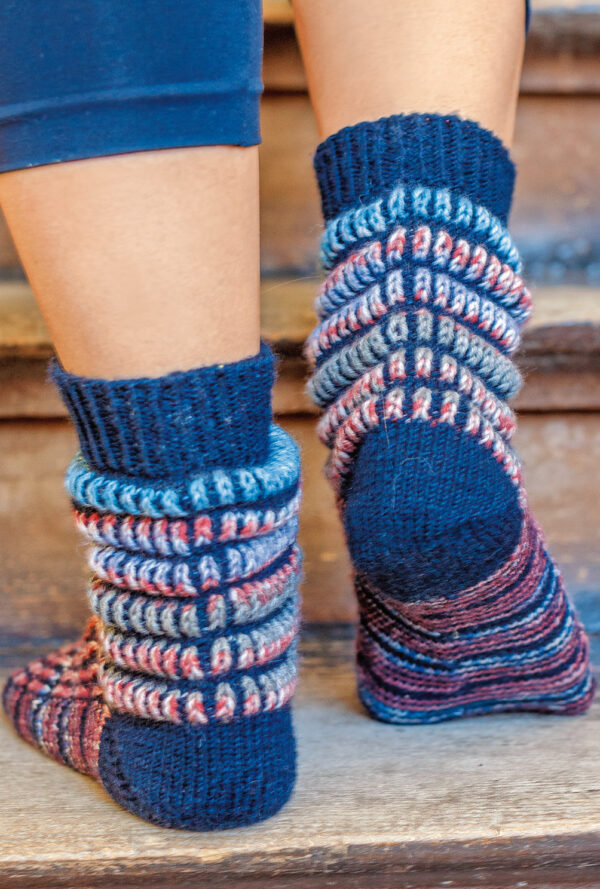Freunde sportlicher Fußbekleidung können sich dank dieser Anleitung Sneaker-Socken mit raffiniertem Rippen- und Lochmuster aus dem Garn «Regia Cotton» von Schachenmayr in den Größen 38/39 und 40/41 stricken. Je nach Kleidung kann man sich dazu die passende Farbe auswählen, denn das Garn ist in vielen verschiedenen Farbtönen erhältlich. Hier wurden die Farben Shell und Sand gewählt, wobei entweder die eine oder die andere Farbe für den kontrastfarbiger Sockenrand verwendet wird. Dank der ausführlichen Strickanleitung inklusive Strickschrift ist das Nacharbeiten auch für etwas ungeübtere Strickerinnen kein Problem.