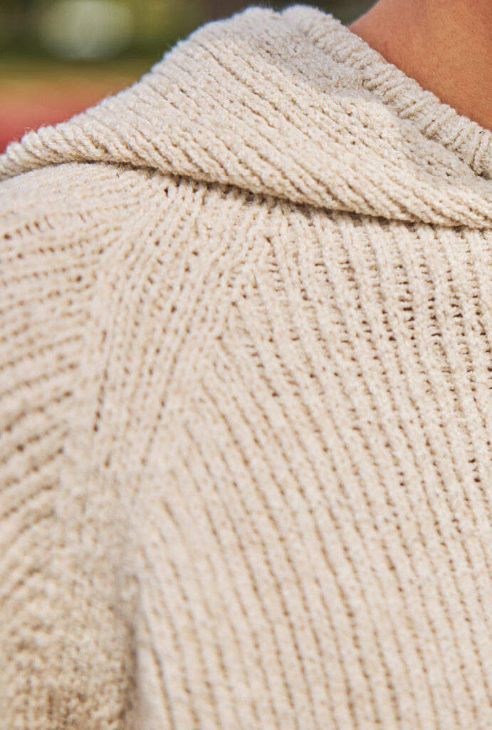 Besonders sportlich kommt dieser Strickhoodie daher, der aus dem cremefarbenen Garn „Avino“, einem elastischen und weichen „Fein-Bouclé Garn“, Raglan gestrickt wird. Gestrickt wird glatt rechts und im Rippenmuster. Die Bindebänder entstehen aus eine 180 cm langen Strickkordel, die auch mit einer Strickliesel oder einer Strickmühle gearbeitet werden kann. Die ausführliche Strickanleitung inklusive Schnittzeichnungen ist für die Größen 36/38, 40/42 und 44/46 notiert und erleichtert das Nachstricken auch für etwas ungeübtere Strickerinnen.