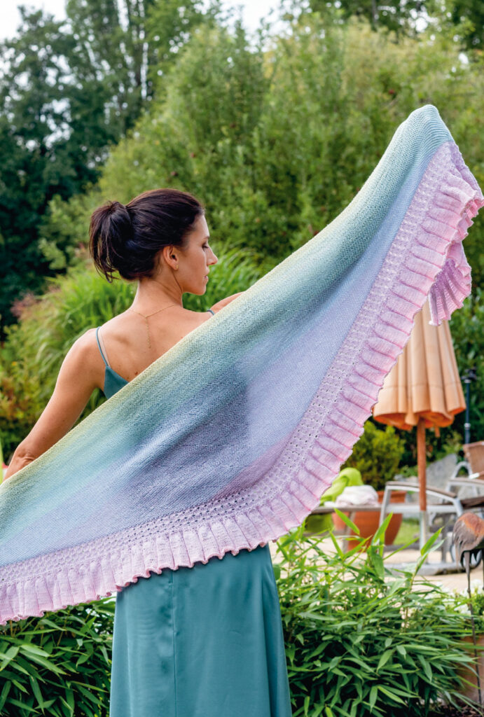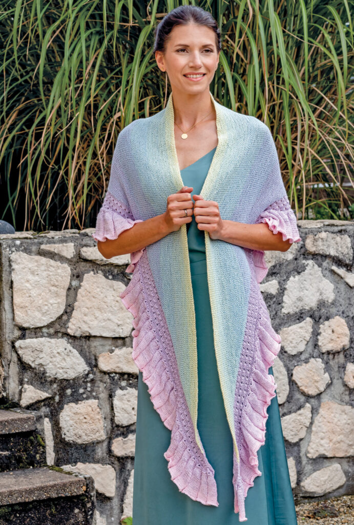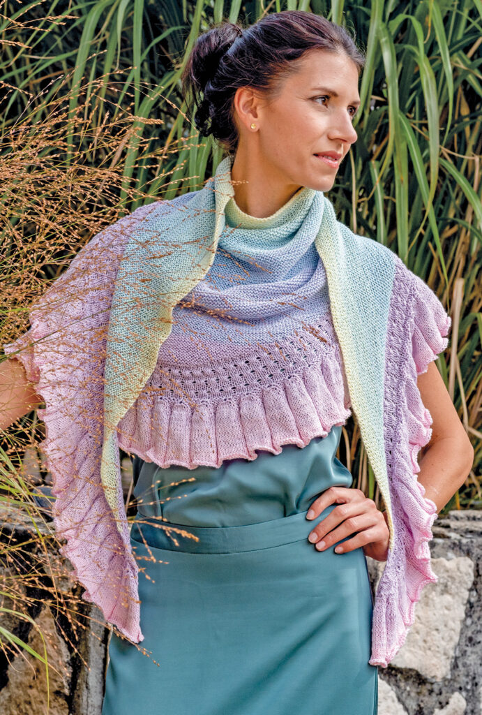 Ein Traum in Pastell mit atemberaubendem Farbverlauf von Rosa zu Flieder über Hellgrün und Hellgelb ist das Dreiecktuch in XXL-Größe mit seiner auffälligen Rüschenbordüre an der Kante, gestrickt aus dem Bobbel Cinderella von Woolhouse. Kurzum: ein richtig tolles sommerliches Accessoire mit trendigem Farbspiel, perfekt zum Umlegen für jede Gelegenheit. Mithilfe der ausführlichen Anleitung fällt das Nacharbeiten des 195 x 60 cm großen Tuches selbst weniger erfahrenen Strickerinnen sicher nicht schwer.