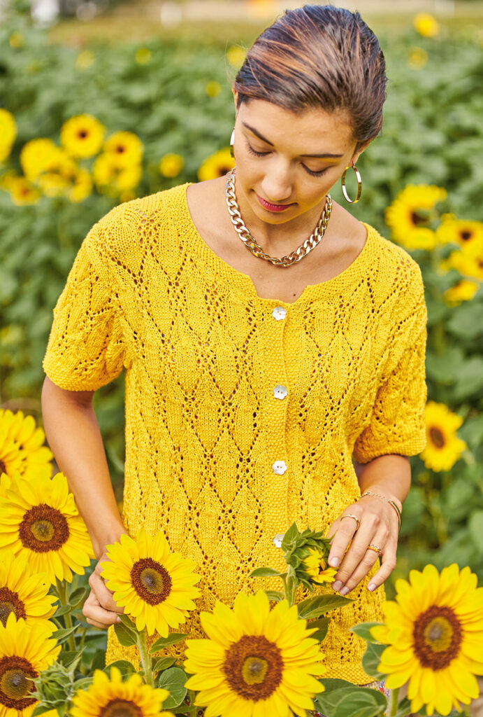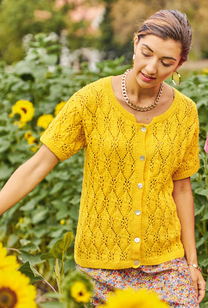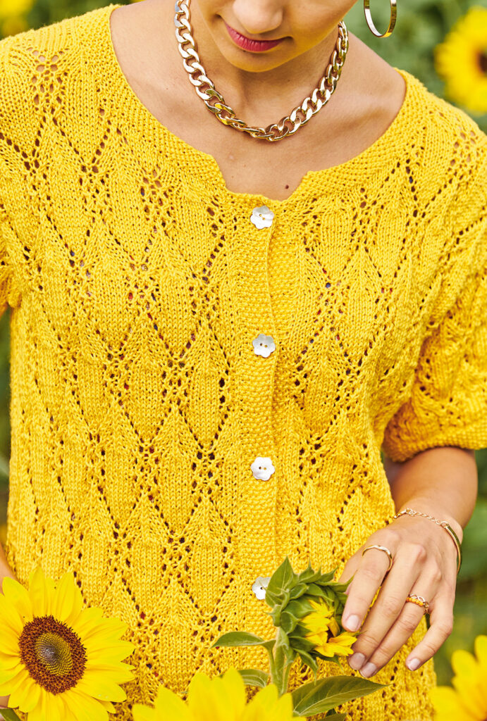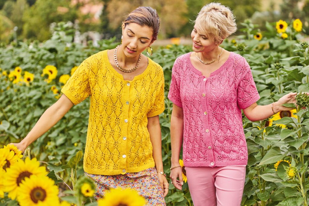 Dieses luftig-leichte Kurzarmjäckchen eignet sich perfekt für einen Spaziergang bei frühlingshaften Temperaturen. Es wird im Perlmuster und im Ajourmuster gestrickt: Je nach Geschmack kann dazu ein sommerliches Gelb oder ein frisches Pink der «Basic Cotton» von PRO LANA gewählt werden. Dazu passend wählt man dann die Farbe der Knöpfe. Dank der ausführlichen Strickanleitung inklusive Strickschrift und Schnittzeichnung gelingt das Nachstricken auch etwas ungeübteren Strickerinnen. Die Anleitung ist für die Größen 36/38, 40/42 sowie 44/46 notiert.