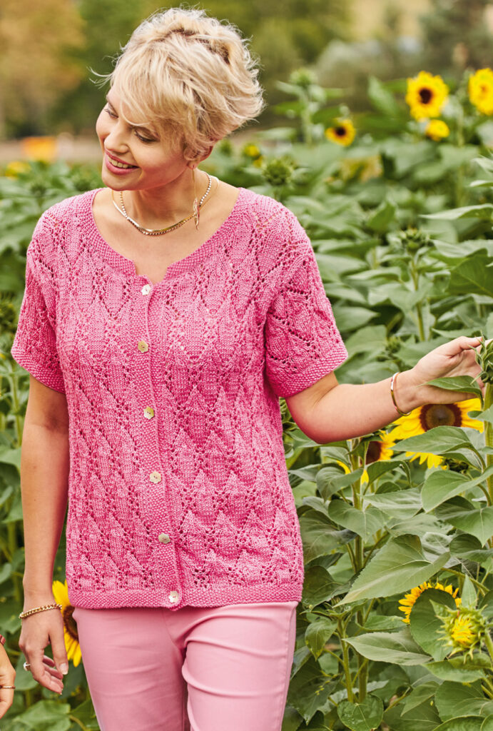Maschen kreativ Gestricktes gelbes oder pinkes Kurzarmjäckchen im Ajourmuster