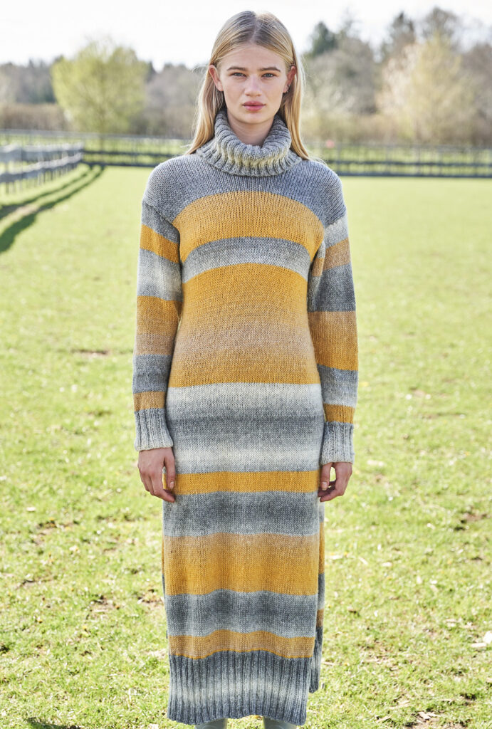Stil trifft auf Komfort: Strickkleider vermitteln pure Behaglichkeit. Hier aus einem grauen und gelben Farbverlaufsgarn, das sich streifenweise in Szene setzt. Modische Details bietet die angesagte legere Form, breite Rippenblenden und hohe Seitenschlitze. Besonders viel Strickspaß bietet das Arbeiten mit dem Dégrade-Garn in zwei unterschiedlichen Farbgebungen im ansonsten schlichten glatt rechts gestricktem dress. Zuzusehen, wie sich die Farben so harmonisch entwickeln spornt zu ungeahnten strickerischen Höchstleistungen an. So sind die vier Teile mit Nadelstärke 6 auch überraschend schnell fertig gestrickt. Dann werden nur noch die Nähte geschlossen und aus dem Halsausschnitt die Rippenblende herausgestrickt.