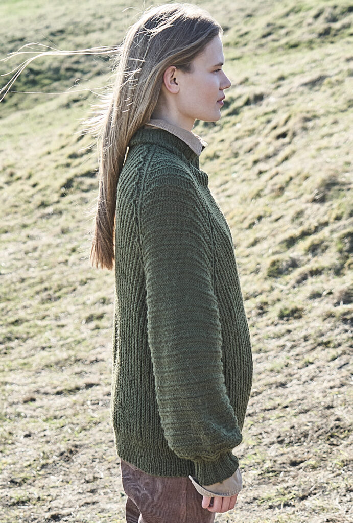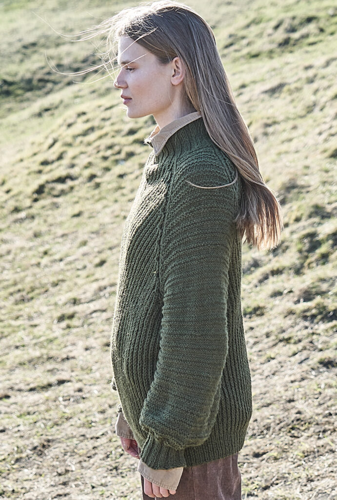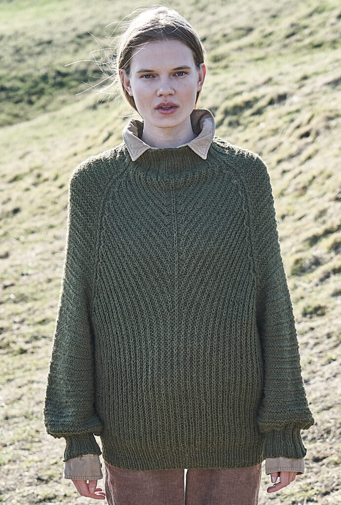 Wer ab und zu raus in die Natur möchte, wählt diesen lässigen Raglanpulli als Begleiter. Er besteht aus einem edlen Alpakamischgarn, das an kühlen Herbsttagen wunderbar wärmt. Und es bringt die Rippenstrukturen toll zu Geltung, die sich mal diagonal, mal quer sehr wirktungsvoll in Szene setzen. Gestrickt wird nahtlos von unten nach oben in Runden, die verschiedenen Musterrichtungen entstehen durch Zu- und Abnahmen, die in der Anleitung genau erklärt werden.