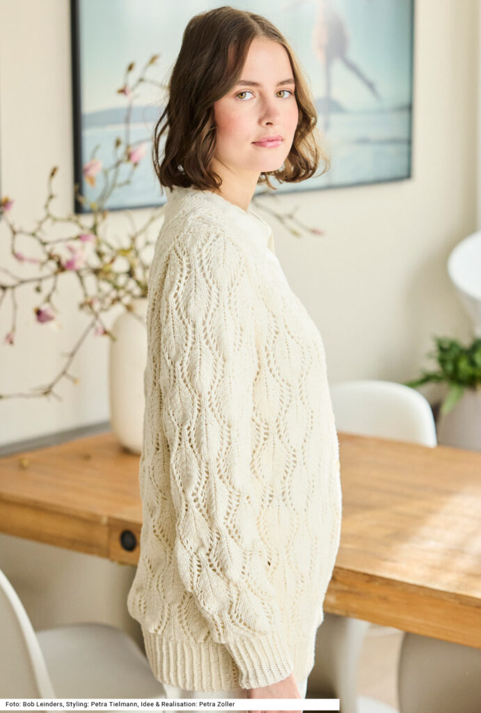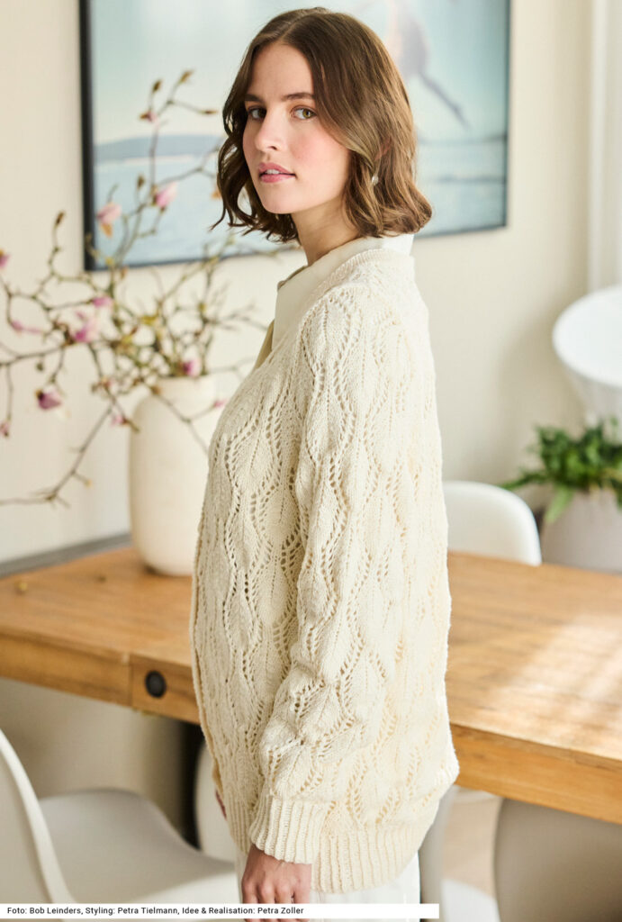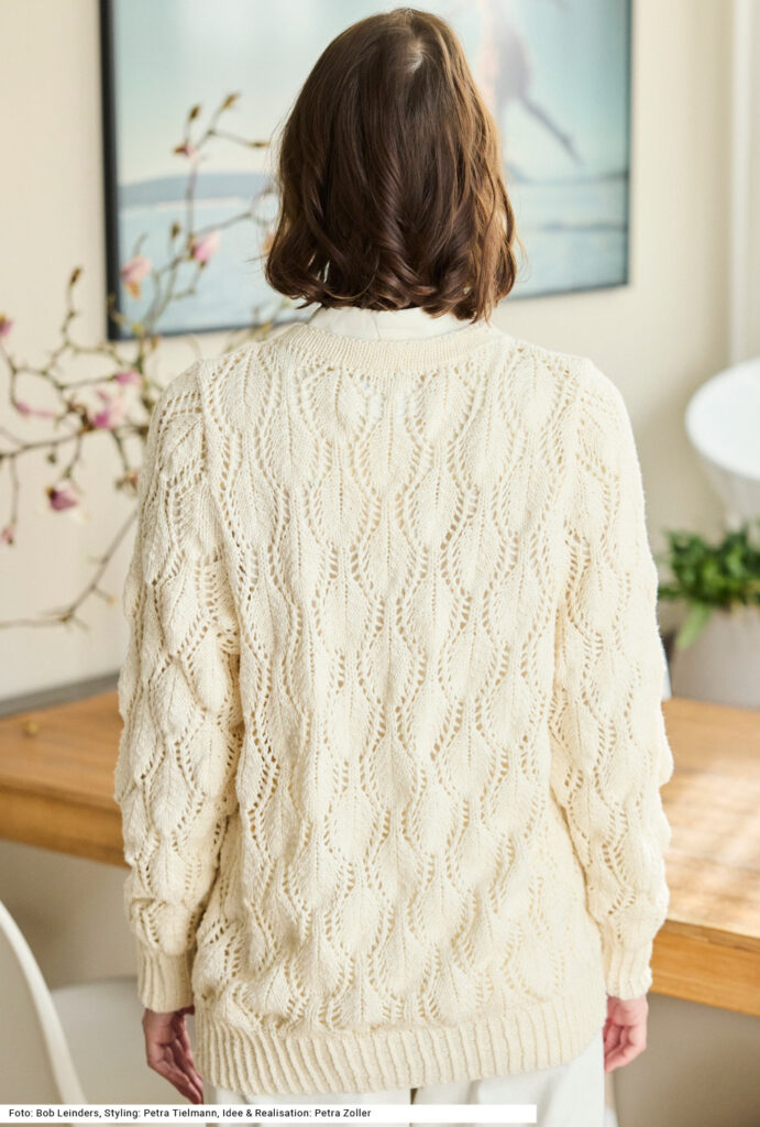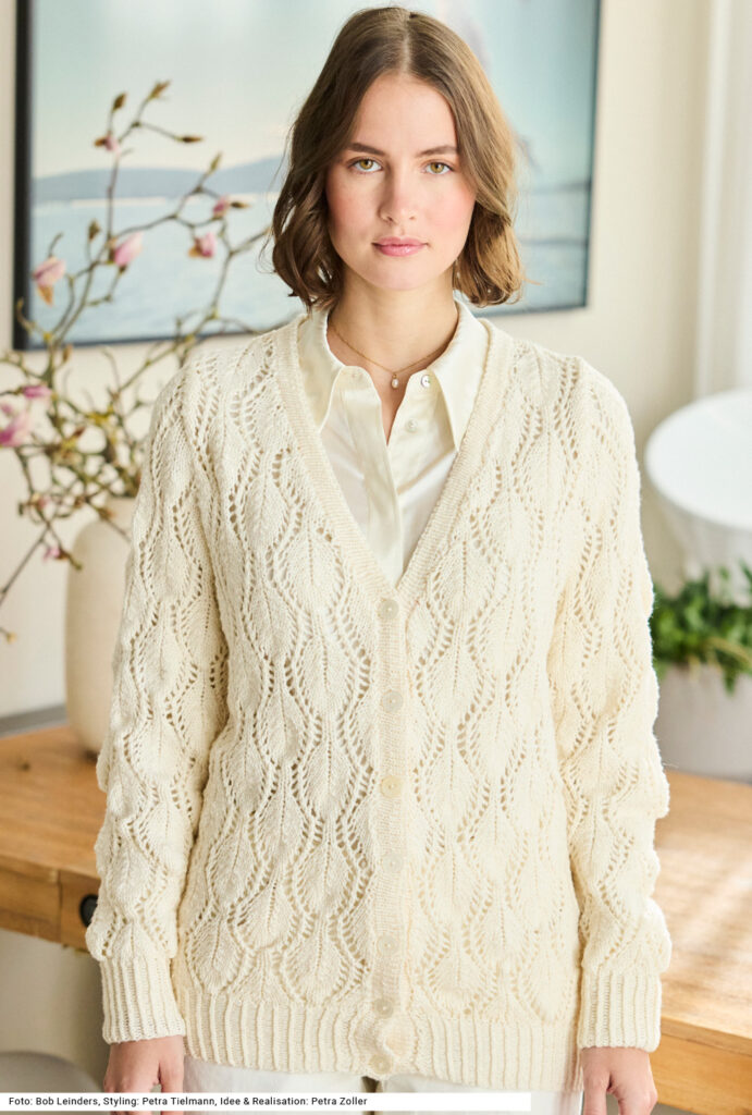 Diese zauberhafte Jacke mit ihrem verspielten Blattmuster sieht besonders gut zu einem schicken Outfit aus. Sie kann aber auch anders, denn auch zu Jeans passt sie hervorragend. Das Modell ist bequem geschnitten und lässt durch das luftige Ajourmuster auch Tops oder Blusen zart durchschimmern. Ärmel mit Armkugel passen an den Schultern perfekt. Saum- und Ärmelbündchen sind im Rippenmuster gearbeitet, die doppelte Knopfblende glatt rechts. Das Garn besteht aus halb Baumwolle und halb Polyacryl. Eine Anleitung gibt es für die Größen 38/40, 44/46 und 50/52.