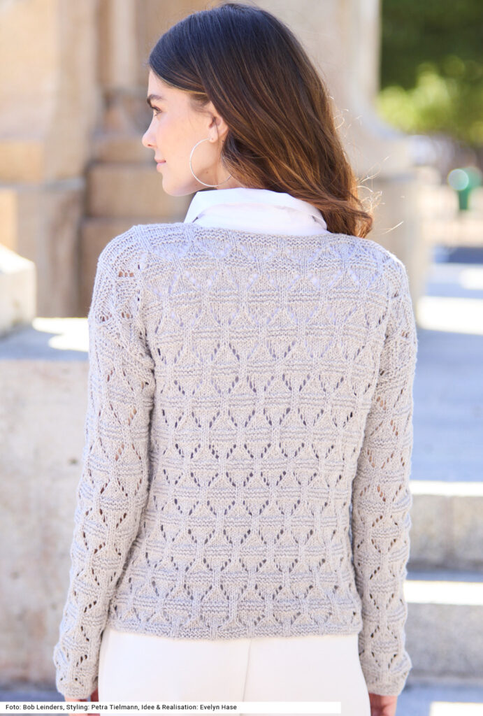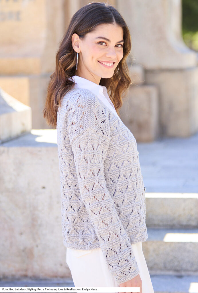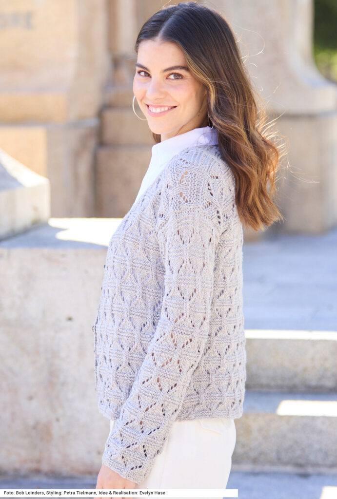 Die Jacke in einem plastischen Rauten-Ajourmuster zählt zu den Modellen, die aus der Garderobe nicht wegzudenken sind – einfach, weil sie multifunktional sind. Das leichte Sommergarn aus Baumwolle und Polyacryl in einer hellen Farbe passt sich jedem Style an, die schmalen Knopfleisten werden direkt mit den Vorderteilen in kraus rechts gestrickt. Ein Bund erübrigt sich und auch eine Blende am V-Ausschnitt, sodass zum Schluss nur noch zusammengenäht werden muss. Die Anleitung dazu kann für die Größen 36/38, 40/42 und 44/46 downgeloadet werden.