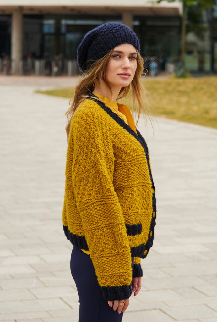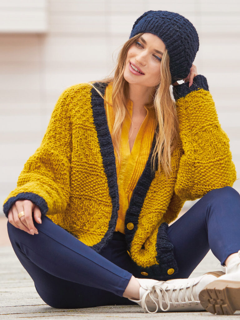 Dieses Set, bestehend aus weiter Jacke und Beanie, ist nicht nur vielfältig kombinierbar, sondern auch spannend zu stricken, wenn man Muster liebt – Schachbrett-, Diagonal-, Rippen- und Perlmuster sind hier harmonisch vereint. Man sieht der Jacke die Gemütlichkeit schon auf den ersten Blick an. Die Jacke ist hauptsächlich curryfarben, mit marineblauen Bündchen und Verschlussblenden, die Mütze ganz in Marine gearbeitet. Das Garn ist aus Schurwolle mit leichter Polyester-Beimischung. Eine Anleitung für die Jacke ist in den Größen 36–40, 42–46 und 48–52 vorhanden, für die Beanie mit 50–52, 54–56 und 58–60 cm Kopfumfang.