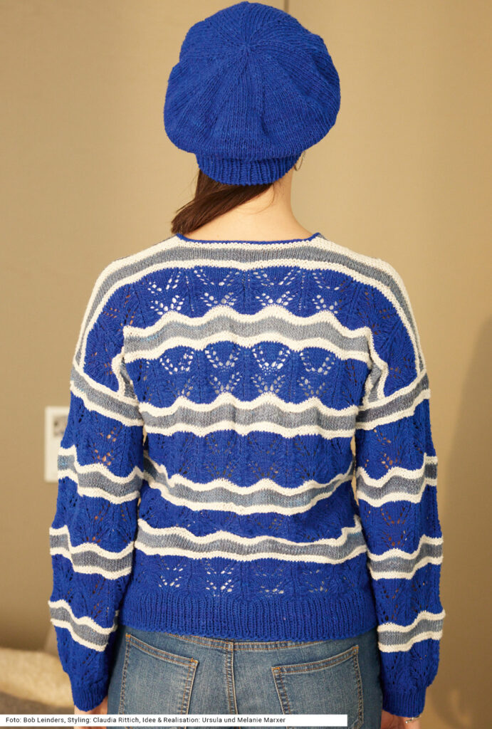 Dieses Set beeindruckt bereits auf den ersten Blick durch seine Farbkraft – die Garnfarbe Pacific wird dem Modell absolut gerecht, das passende Ajour-Wellenmuster mit hellen Streifen in Vanille unterstreicht das maritime Flair zusätzlich. Lässig dazu: die ozeanblaue Baskenmütze. Lediglich Rechtecke werden dazu benötigt, auch bei den weiten Ärmeln, die mit einem schmaleren Rippenbund zusammengehalten werden. Die Jacke ist verschlusslos und hat am vorderen Rand einen I-Cord. Als Garn empfehlen wir eine Mischung aus Baumwolle, Viskose, Seide und Polyamid. Eine Anleitung dazu gibt es für die Größen 38/40, 44/4 und 50/52.