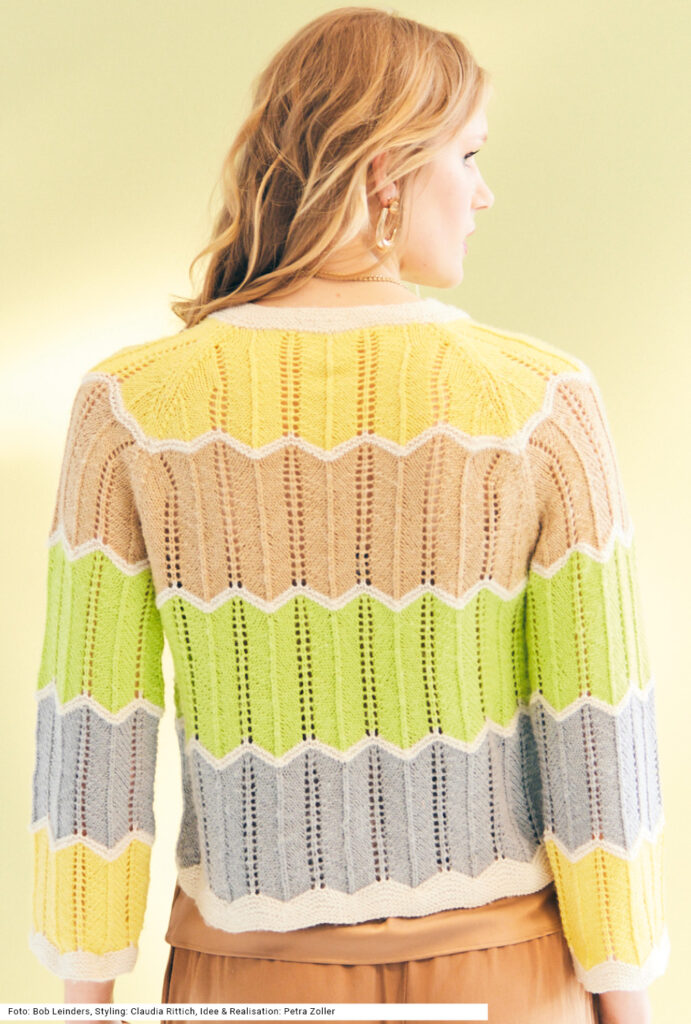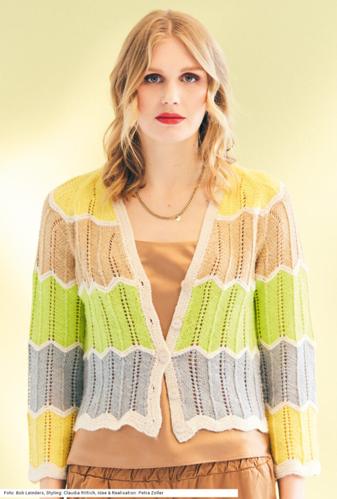 Sabrina Strickjournal Jacke mit Ajour-Blockstreifen in Weiß, Grün, Grau, Beige und Gelb
