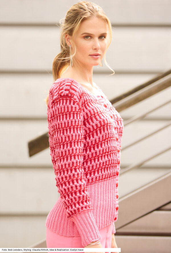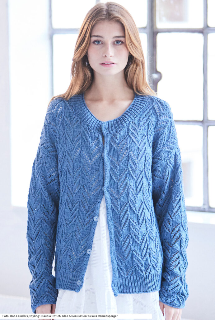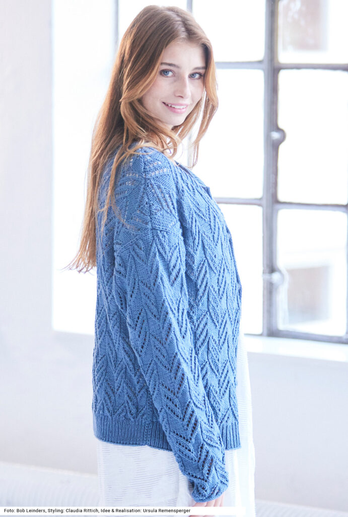Ein rankenartiges Ajourmuster verziert die Jacke, die mit innenliegenden Druckknöpfen geschlossen wird. Der Saumrand und die Blende am etwas tieferen, runden Halsausschnitt sind im 1/1-Rippenmuster gearbeitet. Hübsches Detail: Die letzte Reihe der Ausschnittblende wird glatt rechts gestrickt und rechts abgekettet. Die Vorderteile bekommen jeweils einen I-Cord-Rand, an dessen Rückseite die Druckknöpfe angenäht sind. Die Ärmel enden ganz gerade – das erleichtert das Einnähen. Das Garn aus Baumwolle und Polyacryl kann in der Maschine gewaschen werden. Eine Anleitung gibts für die Größen 38/40, 42/44 und 46/48.