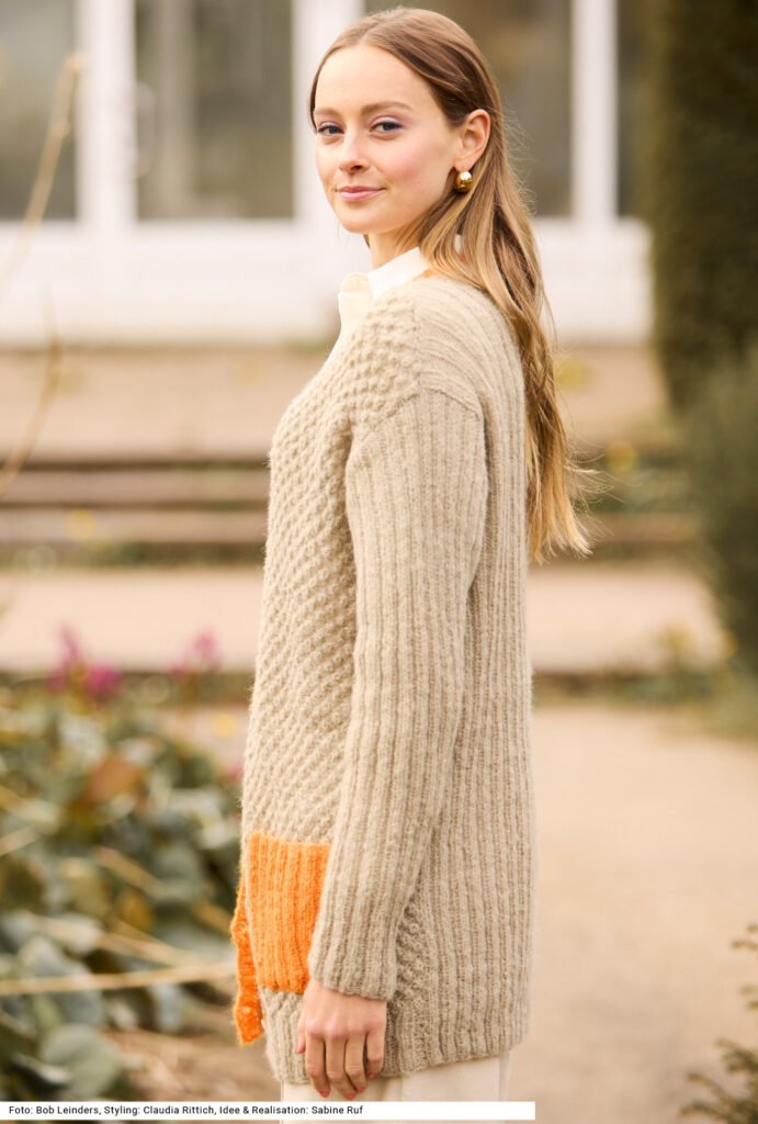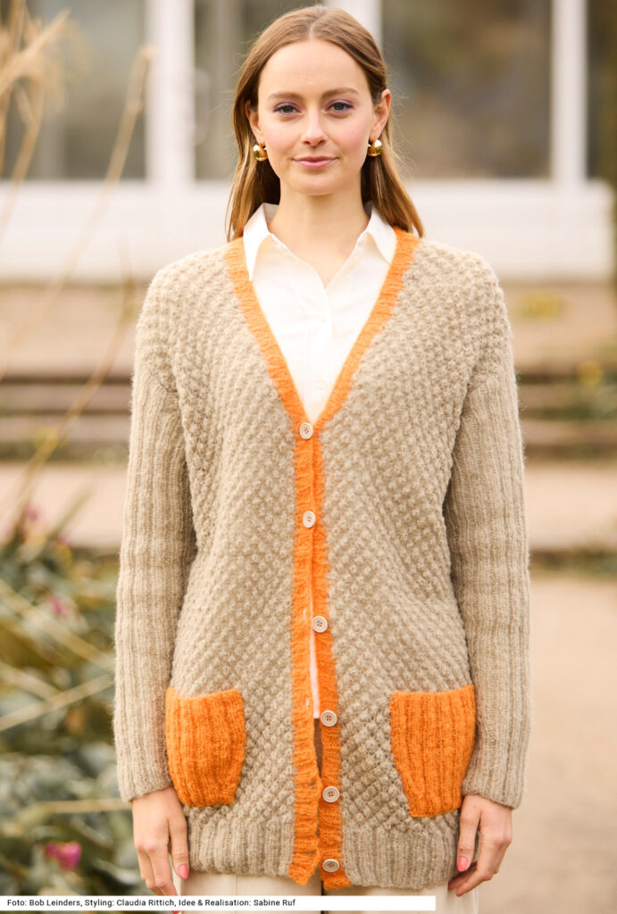 Ein Allrounder für viele Gelegenheiten: die Jacke mit Dornröschenmuster (auch Persianermuster genannt) vereint Geradlinigkeit mit einem hohen Kuschelfaktor; das liegt am Garn aus reiner Alpakawolle. Optisch sorgt der Farbakzent im Bereich der Taschen und der Blende für ein modisches Highlight. Die Ärmel mit flacher Armkugel sind ganz im Rippenmuster gestrickt, ebenso die Vorderteilblenden und die Taschen. Die aufgesetzten Taschen verjüngen sich nach unten hin. Eine Anleitung für dieses Modell gibt es für die Größen 40/42, 44/46 und 48/50.