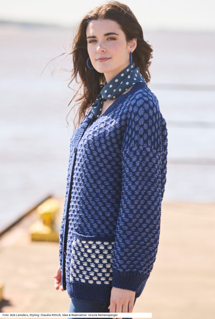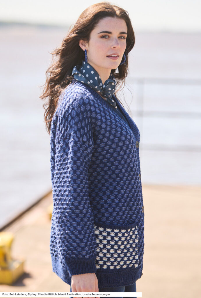 Bei dieser V-Ausschnitt-Jacke im Allover-Hebemaschenmuster stehen die Taschen optisch im Mittelpunkt – sie werden farblich abgesetzt und ziehen so die Blicke auf sich. Das Muster ist schnell gelernt, es werden immer abwechselnd 2 Reihen in der einen und 4 Reihen in der anderen Farbe gearbeitet. Die ganz geraden weiten Ärmel haben einen Rippenbund wie auch die Vorderteile, das Rückenteil und auch die zuletzt angestrickte rundum aufgefasste Knopfblende. Eine Anleitung gibt es für die Größen 38/40 und 42/44 sowie 46/48.