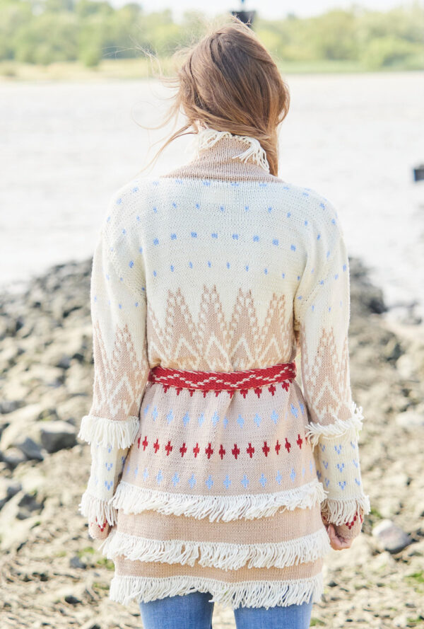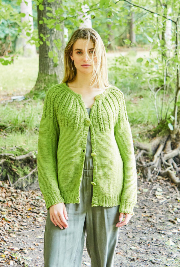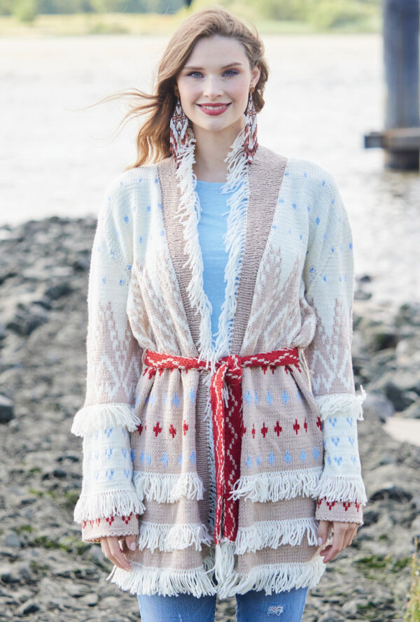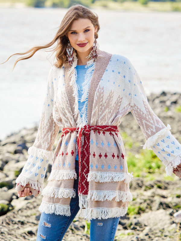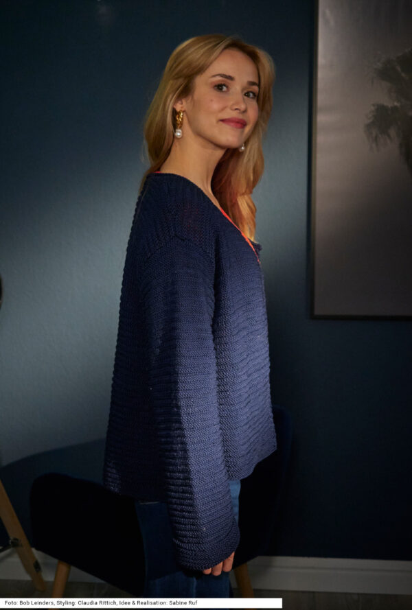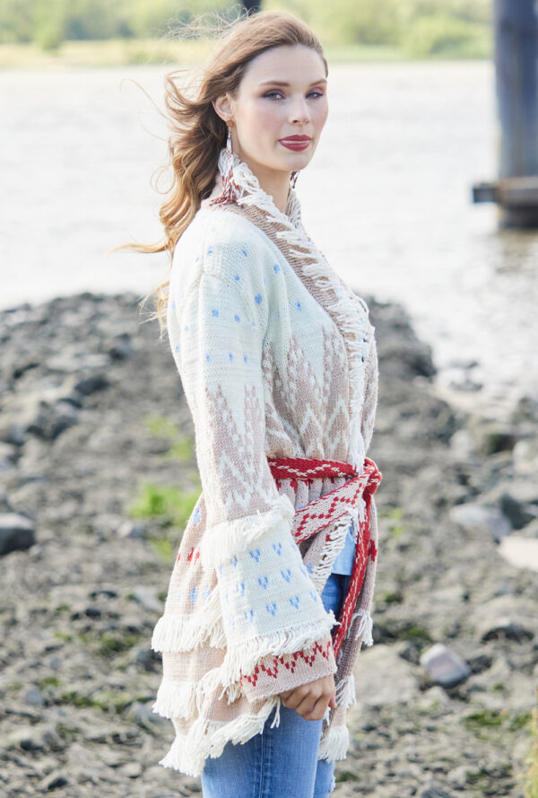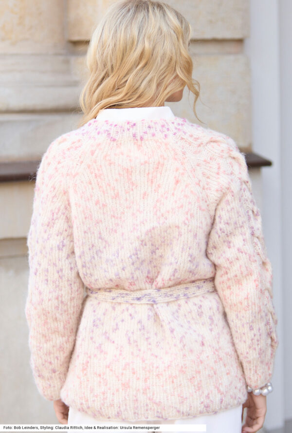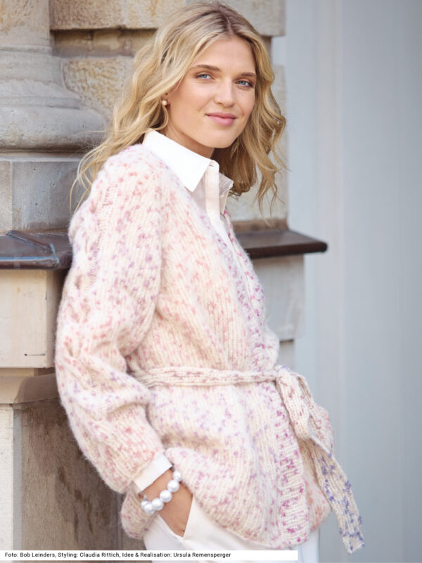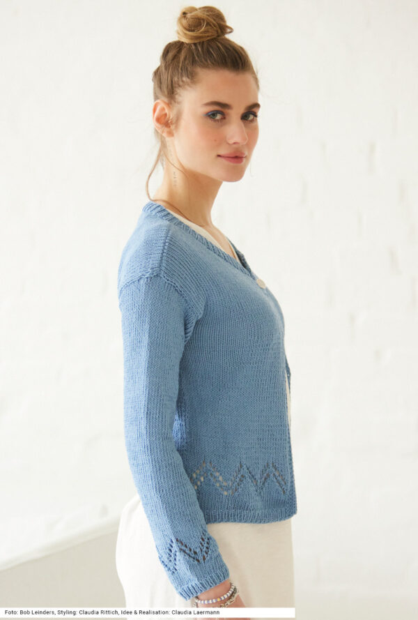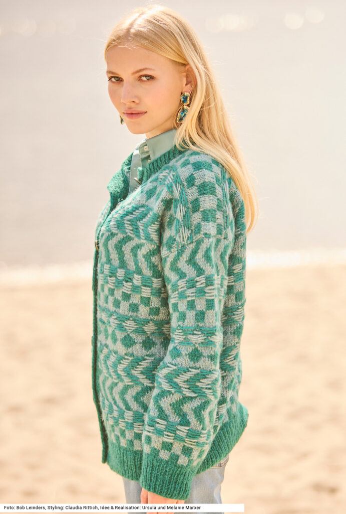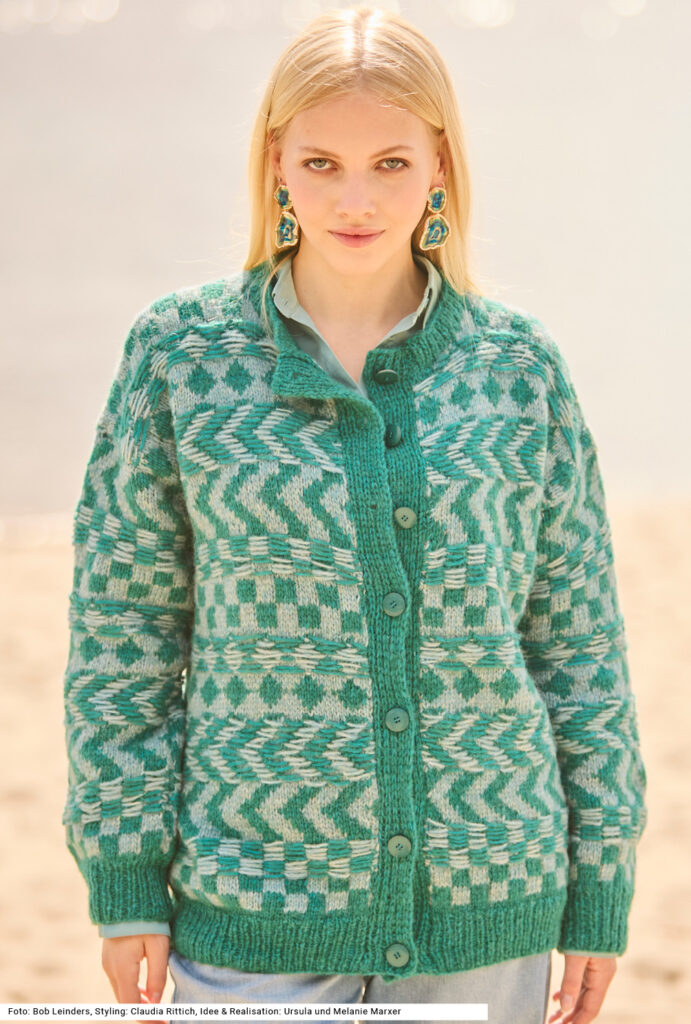Ein Cardigan, der gut und gerne schon mal die Outdoor-Jacke ersetzt. Mollig warm ist das Modell, dabei aber dank des federleichten Garns aus Alpaka, Baumwolle und Schurwolle relativ leicht. Die grafischen Jaquardmusterstreifen haben immer wieder flotierende Reihen (so das Fachwort für vor dem Gestrick verlaufende Fäden) und machen das Muster so interessant. Es sieht sowohl in gedeckten als auch in frischen Farben gut aus. Der Schnitt ist gerade und weit, die Ärmel bekommen erst nach oben hin ihre endgültige Weite. Eine Anleitung steht in den Größen 38/40, 42/44 und 46/48 zur Verfügung.