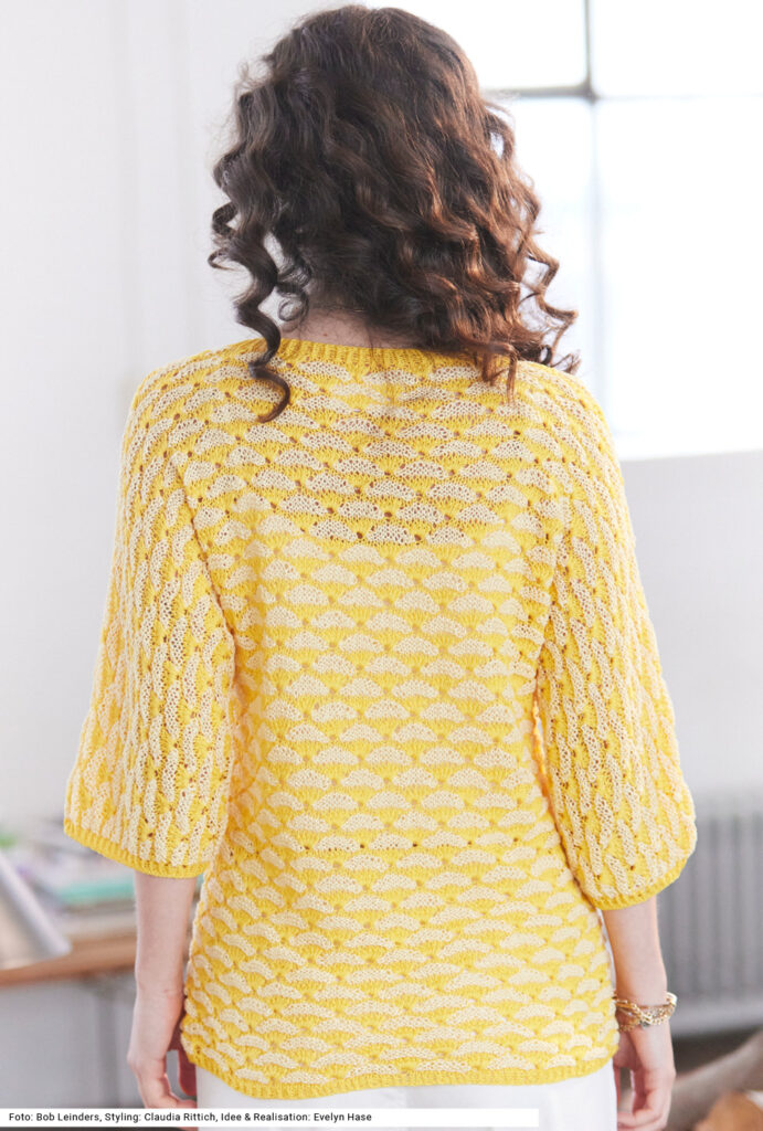 Bei dieser Jacke aus 100 Prozent Baumwolle vereinen sich zwei Farben aus derselben Farbwelt, aber mit unterschiedlichem Charakter. Das plastische Muster entsteht durch tiefgestochene Maschen über vier Reihen hinweg. Das Modell ist einfach geschnitten: Vorderteile und Rückenteil werden jeweils mit ellenbogenlangen Ärmeln in einem Stück gestrickt. Die schmalen Bündchen und die Vorderteil- sowie Ausschnittblende sind im Rippenmuster 1 Masche rechts verschränkt, 1 Masche links gearbeitet. Die Anleitung kann für die Größen 36/38, 40/42 und 44/46 downgeloadet werden.