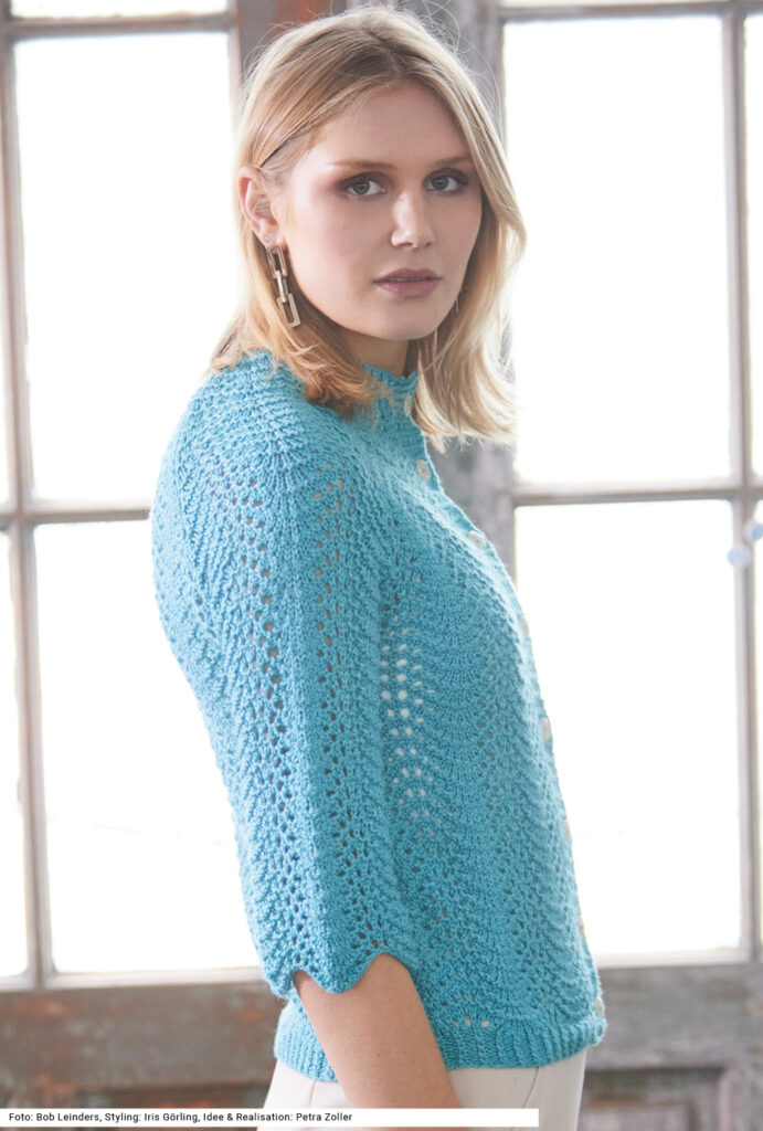 Diese elegante türkisfarbene Jacke mit dreiviertellangen Ärmeln liegt angenehm auf der Haut – Grund dafür ist die Mischung aus Seide und Schurwolle des Garns. Zudem sind die Ärmel im unteren Bereich etwas weiter geschnitten, sodass das Modell bequem an kühleren Abenden übergezogen werden kann. Der Bund und die Halsausschnitt- sowie die Knopfblende sind 1 Masche rechts verschränkt, 1 Masche links gestrickt. Das Wellenmuster, das mal dichter, mal löchriger erscheint, ist nicht schwer zu stricken. Eine Anleitung kann für die Größen 36/38, 42/44 und 48/50 downgeloadet werden.