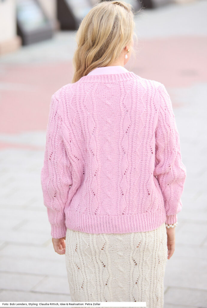 Dieses Duo aus kuscheliger Lamm-Schurwolle ist das Muster zwar dasselbe, jedoch durch die unterschiedlichen Farben kommt Pep in das Ganze. Beide Teile haben kleine Zöpfchen, Blatt- und Rautenmuster. Bei der Jacke mit V-Ausschnitt und Knopfblende wechseln sich also dreierlei Ajourmuster symmetrisch ab; ebenso beim passende Rock, der sich zur Taille hin verjüngt und so die Figur betont. Der Rockbund wird im Rippenmuster gestrickt; zum Schluss kommt noch eine gehäkelte Runde fester Maschen am Saum dazu. Eine Anleitung kann für die Größen 38/40, 42/44 und 46/48 downgeloadet werden.