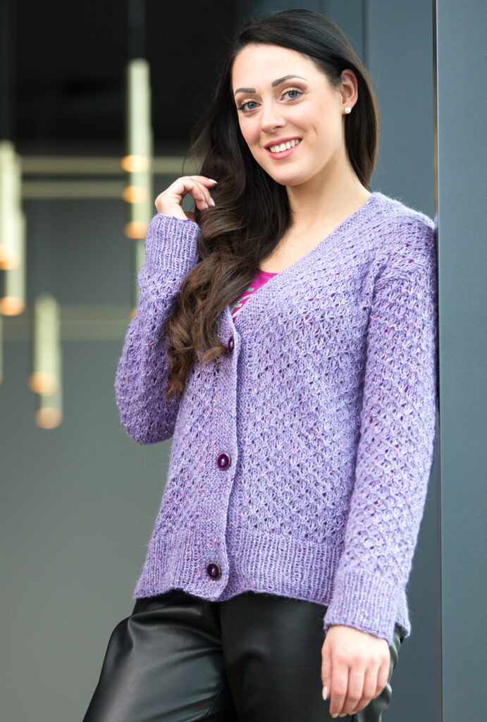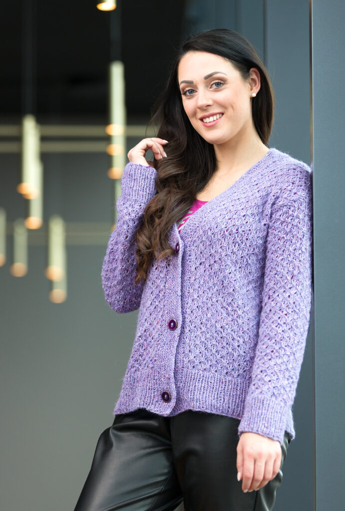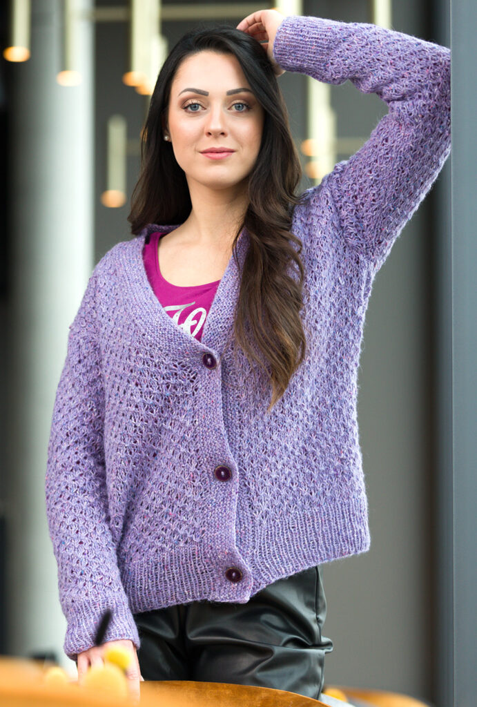 Die tweedige Anmutung des modischen Mischgarns verleiht dem klassischen Cardigan mit V-Schrägung eine modische Optik, lässt aber auch das attraktive Sternmuster ausdrucksstark wirken. Dieses strukturierte Muster ist nicht schwer zu stricken, es werden lediglich in den Rückreihen linke Maschen gestrickt, denen ein Umschlag vorausgeht, der dann über die Maschen gezogen wird. Die breiten Bündchen sind in 1/1-Rippen gearbeitet, die Knopf- und Ausschnittblende ist kraus rechts gestrickt. Mit ein wenig Strickerfahrung gelingt dieses Modell auch StrickerInnen mit noch wenig Kenntnissen. Die Anleitung steht zum Download bereit für die Größen 36/38, 40/42, 44/46, 48/50 und 52/54.