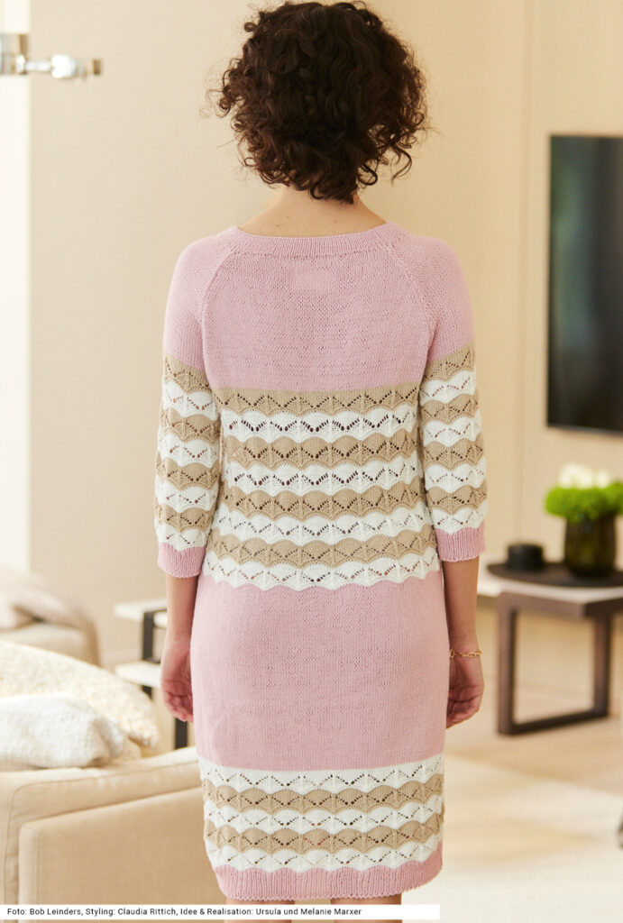 In diesem bequemen Kleid mit Raglanschrägungen kann man sich nur wohlfühlen. Sein lebhaftes Wellenmuster in weißen und sandfarbenen Streifen wird blockweise zwischen glatt rechts gestrickten rosafarbenen Flächen angeordnet. Bis zu den Armausschnitten sind alle Teile – auch die Ärmel – ganz gerade geschnitten und deshalb so figurschmeichelnd. Alle Bündchen sind im Rippenmuster, die Blende am runden Halsausschnitt ebenfalls, jedoch im Doppelstrick gearbeitet. Das weiche Garn aus reiner organischer Baumwolle trägt sich sehr angenehm. Eine Anleitung gibt es für die Größen 36/38, 42/44 und 46/48.