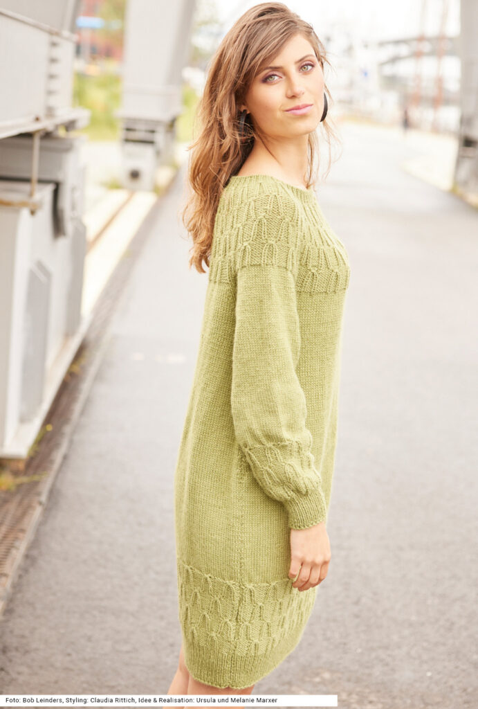 Sabrina Strickjournal Kleid mit Rundpasse und Re-links-Muster in hellem Grün