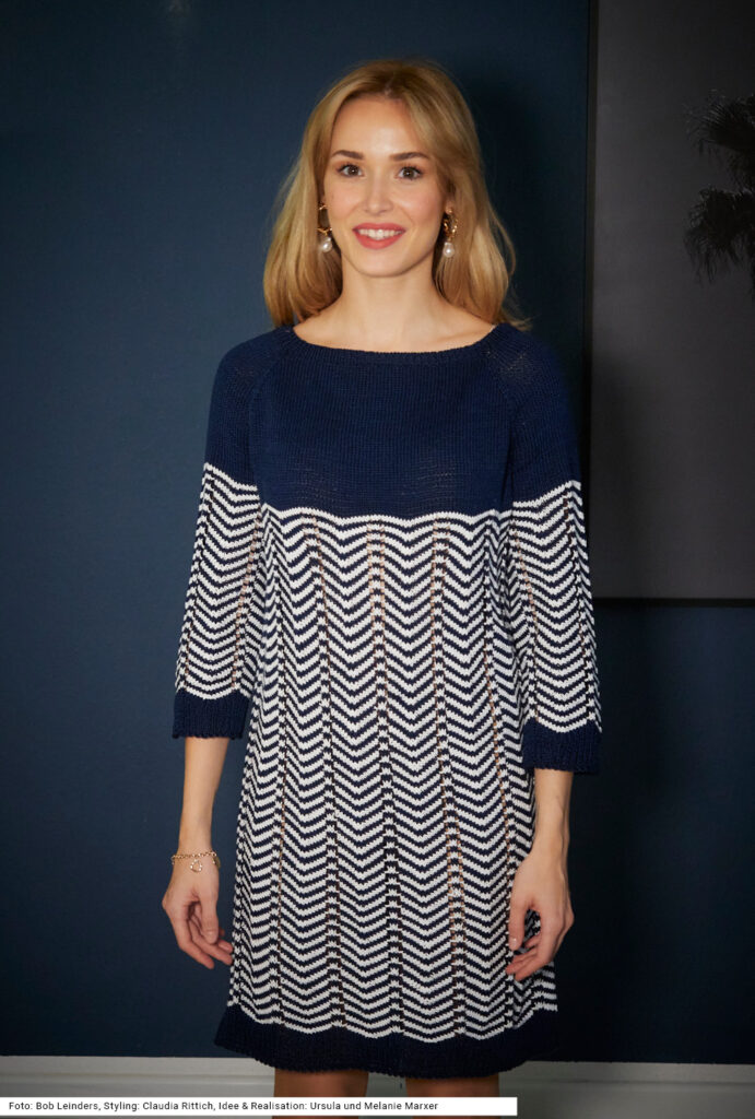 Sabrina Strickjournal Kleid mit Zackenmuster in Dunkelblau und Weiß