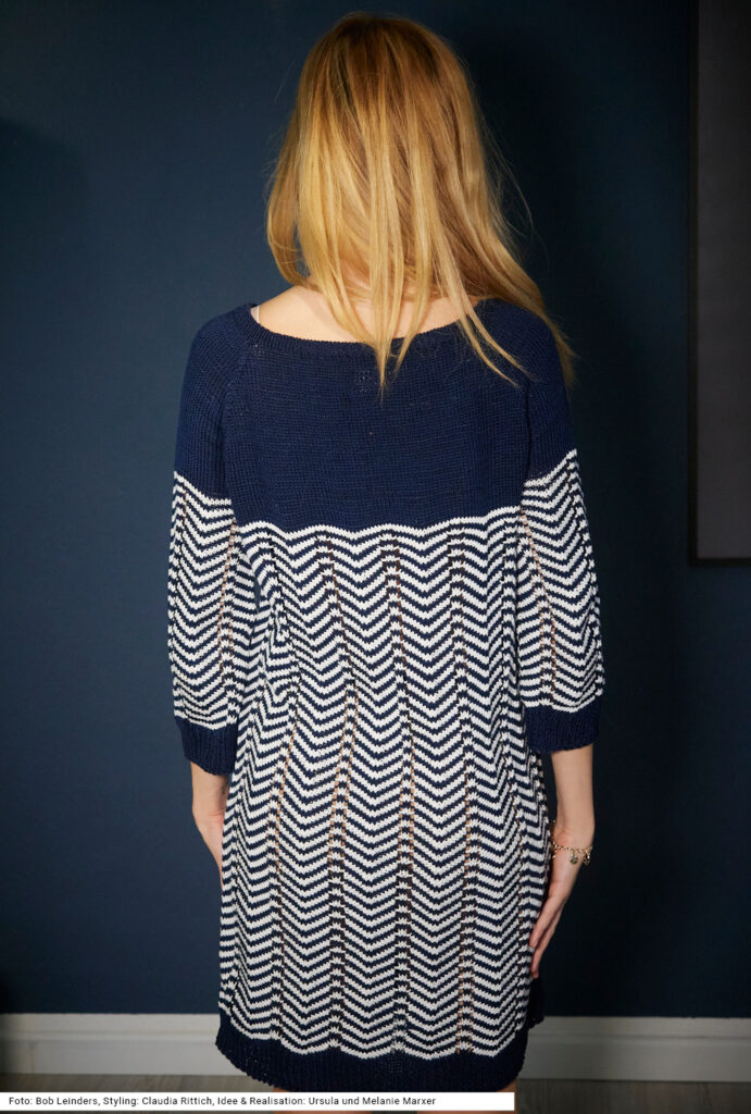 Dieses maritime Kleid aus reiner Baumwolle steht nicht nur jedem Figurtyp hervorragend, sondern eignet sich dank des simplen Zackenmusters in Weiß und Dunkelblau auch für Strickneulinge mit ersten Strickerfahrungen, die die Geduld aufbringen, ein größeres Strickstück zu arbeiten. Raglanschrägungen und Rippenbündchen sorgen zudem für eine perfekte Passform. Die Halsausschnittblende wird im Doppel-Strick gearbeitet, das heißt, es wird stets 1 Masche gestrickt und 1 M abgehoben im Wechsel – und italienisch abgenäht; man kann die Maschen aber auch einfach abketten. Die Anleitung kann für die Größen 36/38, 40/42 und 44/46 downgeloadet werden.