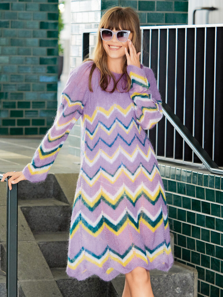 Eindrucksvolles Zackenmuster trifft legeren Schnitt – Und heraus kommt ein kuscheliges und gleichzeitig federleichtes Kleid, das alle Blicke auf sich zieht. Das zarte Ajour-Zackenmuster wird durch die unterschiedlichen farbigen Streifen toll akzentuiert. Die schlichte Passe im Rippenmuster sitzt perfekt. Das ist nicht nur spannend anzuschauen, sondern macht auch beim Stricken richtig Spaß. Die Teile werden von unten nach oben in Nadelstärke 4 gestrickt. Das kuschelige Mohairgarn gibt es bei Austermann. Strickschrift und Schnitt machen das Nachstricken zum Kinderspiel und auch das Zackenmuster hat man ganz schnell im Kopf. Die Anleitung enthält die Größen 38/40 und 42/44.