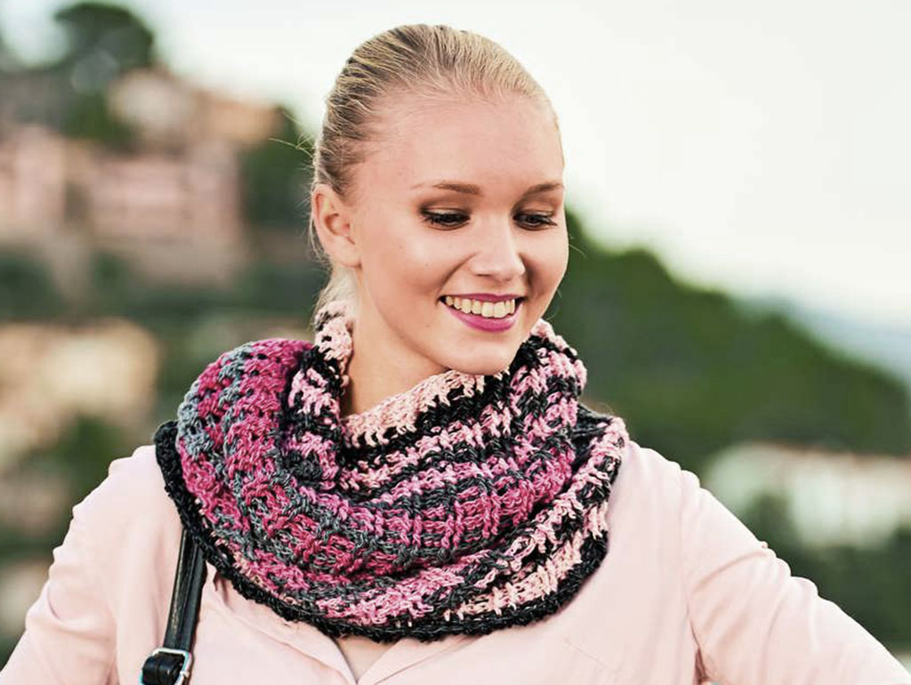 Ein kleiner Loop, gehäkelt mit Reliefmaschen, die ein tolles rustikales Maschenbild ergeben. Besonders reizvoll sind die Streifen, denn diese entstehen durch den Woolly Hugs Bobbel BUTTERFLY wie von Zauberhand ganz von selbst. Durch die Reiefmaschen wirken die Streifen wie verwaschen, also ohne klare Trennlinie, wodurch der Schal besonders hübsch und interessant aussieht.