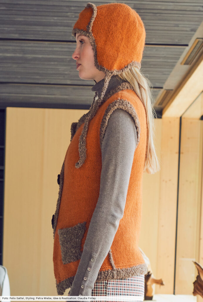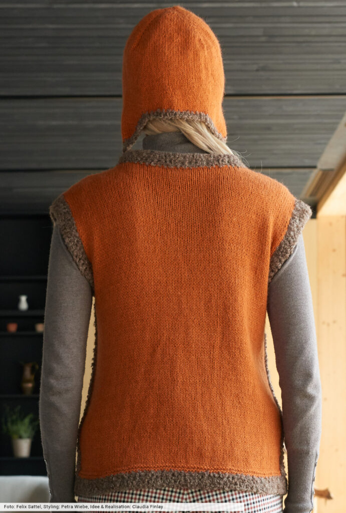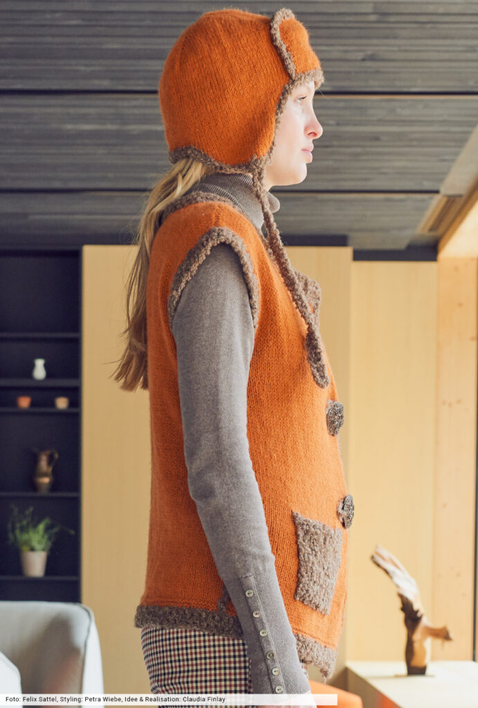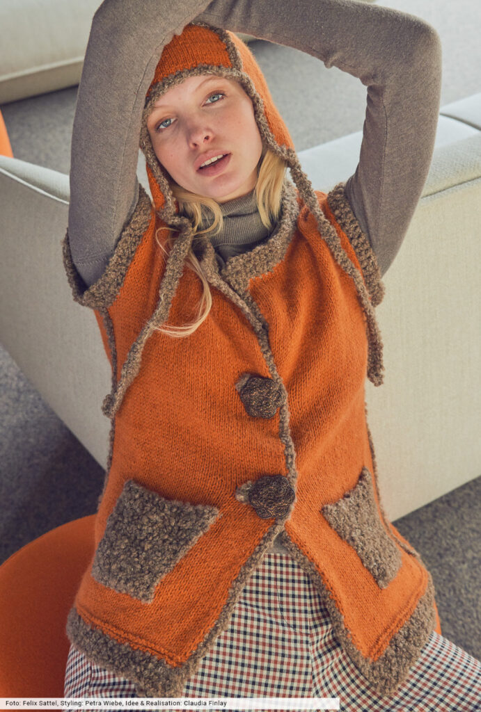 Diese glatt rechts gestrickte Weste vermittelt durch die Bouclé-Effekte von Taschen und Blenden den Boho-Spirit, der dem Maschenstyle die aufregende Ausstrahlung verleiht. Dazu tragen auch die artisanalen Knöpfe bei. Wer Lust hat, strickt sich noch die passende Mütze – eine modische Balaclava – dazu und erhält ein Ensemble, das Blicke auf sich zieht.