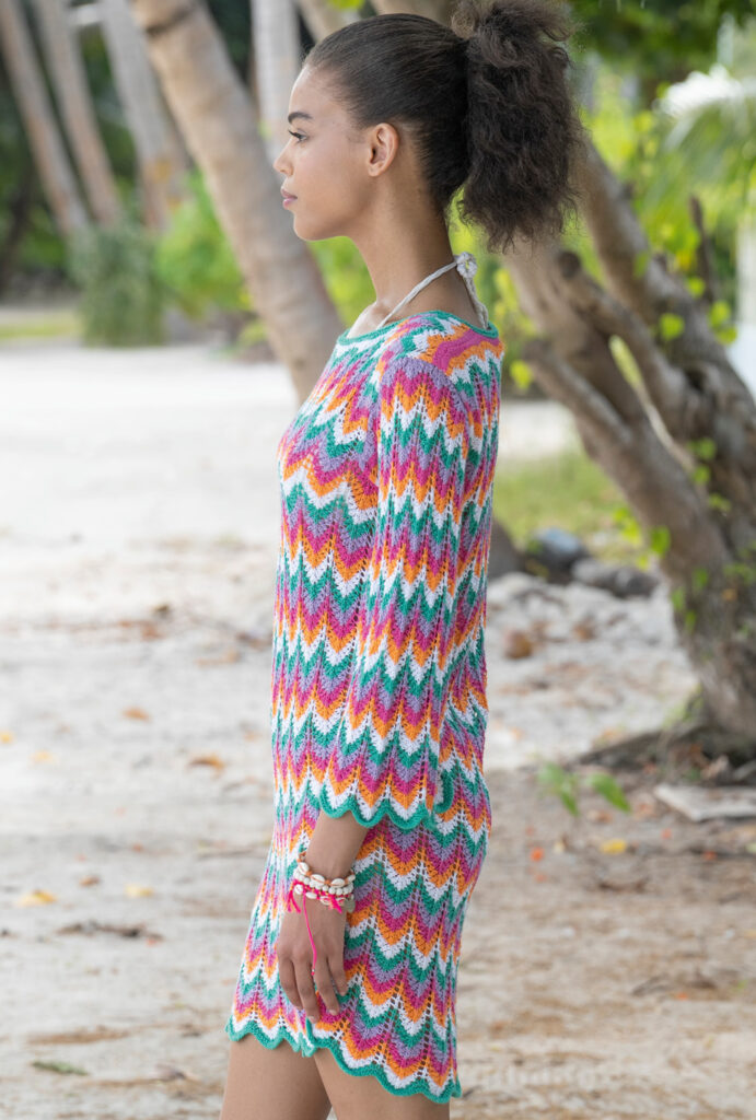 Grün, Orange, Pink und Flieder: Ganz schön auf Zack sind die Farben dieses flotten Sommerkleides, bei dem weiße Blitzlichter für zusätzliche Frische sorgen. Im Pfauenmuster wächst das gute Stück Streifen für Streifen, am Vorder- und Rückenteil ganz gerade, bei den Ärmel in modischer Trompetenform. Diese entsteht durch Abnahmen innerhalb des Pfauenmuster, die in unserer Anleitung genau beschrieben sind. Der Halsausschnitt ist eckig (gut bei dem Muster!) und wird zum Schluss mit einer schmalen Kraus-rechts-Blende eingefasst.