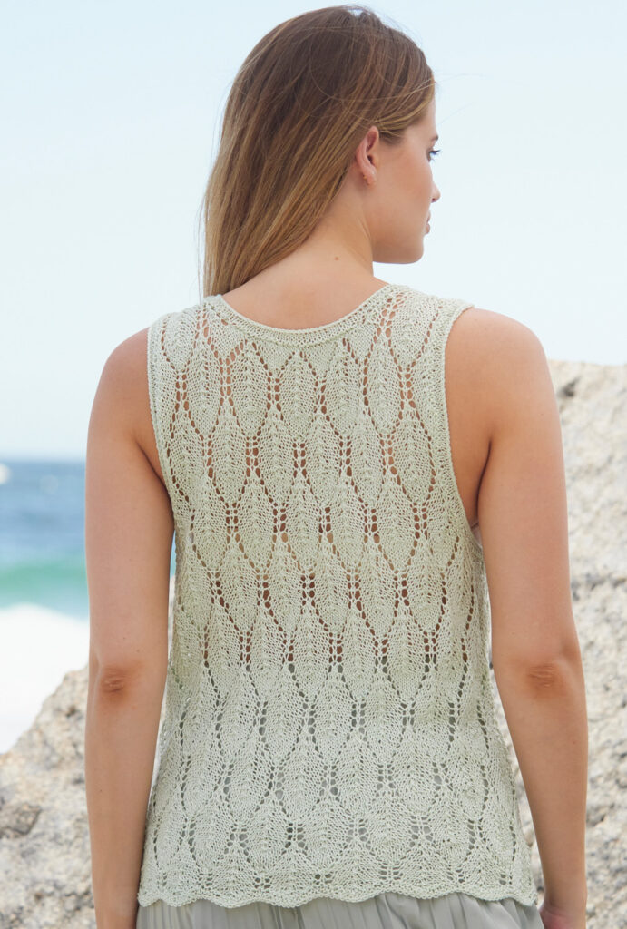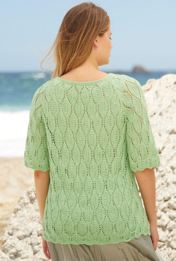 Das Set aus Top und Jacke wird aus einem leichten Baumwolle-Viskose-Garn gearbeitet. Es bezaubert mit seinem Allover-Ajourmuster und den unterschiedlichen Grüntönen in hellem und mittlerem Grün. Die Raglanjacke mit bis zu den Ellbogen reichenden Ärmeln und weitem Halsausschnitt lässt sich abends rasch überziehen und passt tagsüber bequem in die Tasche. Das ärmellose Top ist im Sommer genau das Richtige. Für die Jacke werden alle Bündchen und die Knopfblende kraus rechts gearbeitet, beim Top ist der Bund kraus rechts, Halsausschnitt und Armausschnitte glatt rechts umstrickt. Die Anleitung kann in den Größen 38/40, 42/44 und 46/48 downgeloadet werden.