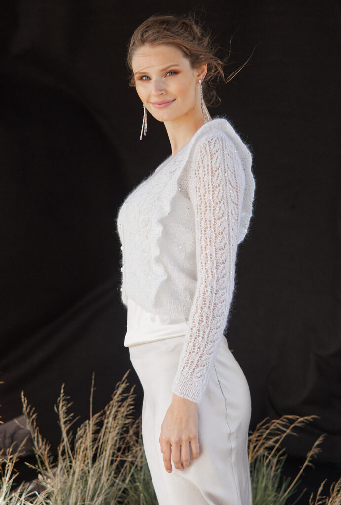 Dieses kurze Jäckchen ist aus einem Mischgarn (Mohair, Schurwolle, Seide und Synthetik) gestrickt, in dem die Pailletten gleich eingearbeitet sind. Die Rüschenblenden an den Seiten und die zwei verschiedenen Ajourmuster unterstreichen die Luftigkeit und Romantik des Looks. Ein herzförmig verlaufender V-Ausschnitt passt perfekt zum gesamten Style, wie auch die kleinen, runden Perlmuttknöpfe. An den Seiten, quasi zwischen den Rüschenvolants, ist die Jacke ganz einfach glatt rechts gearbeitet. Eine Anleitung steht für die Größen 36/38, 40/42 und 44/46 zum Download bereit.
