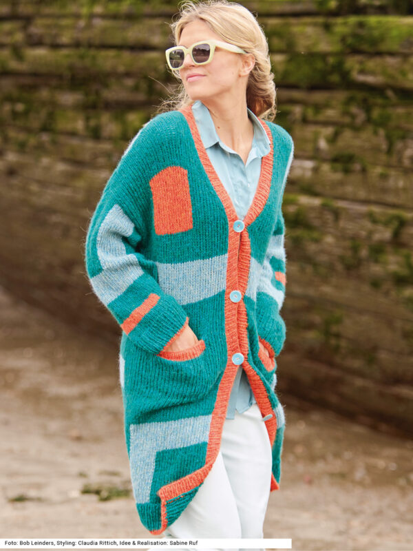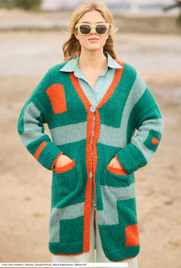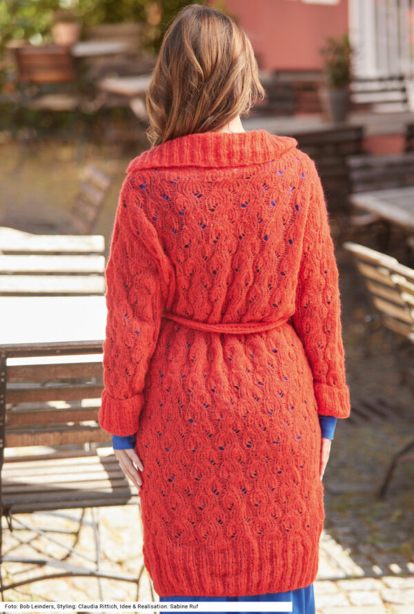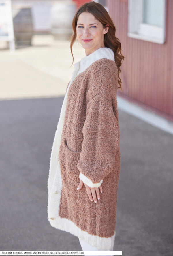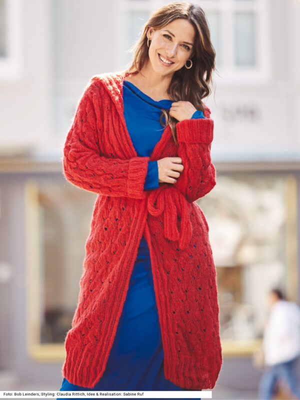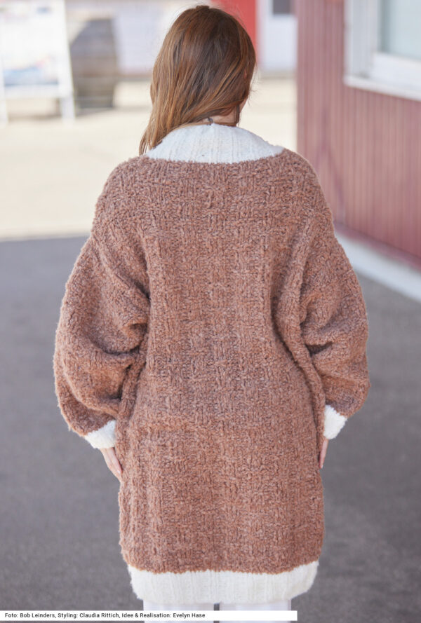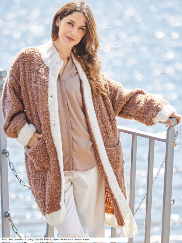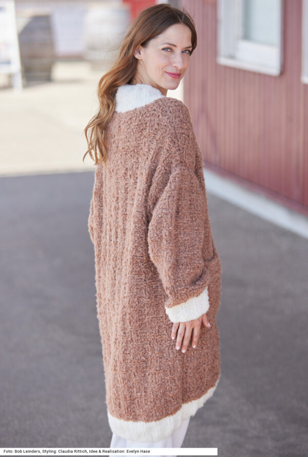 Mit kurzen Strickmänteln geht’s schwungvoll in den Winter. Dieser besteht aus Rippenstrukturen, der Schnitt samt Kragenblende ist perfekt gestaltet und eingearbeitete Taschen gibt es auch noch – was will man mehr! Gerade Teile mit Schulter- und V-Ausschnittschrägung machen das Zusammennähen einfach, wird doch die Reversblende gleich mitgestrickt. Unkompliziert ist auch das Reliefmuster, nur aus rechten und linken Maschen, und die unterlegten Taschenbeutel in glatt rechts. Ein weiches Garn aus Schurwolle und Kamel mit einer langen Lauflänge (mit 6er-Nadeln gestrickt) machen diesen rosenholzfarbenen Mantel zum Leichtgewicht. Eine Anleitung steht für die Größen 38/40, 42/44 und 46/48 zur Verfügung.