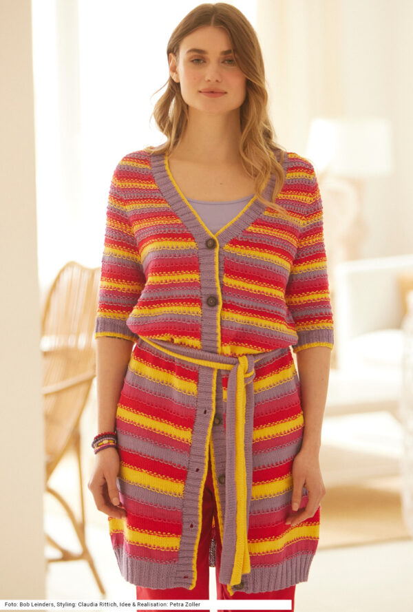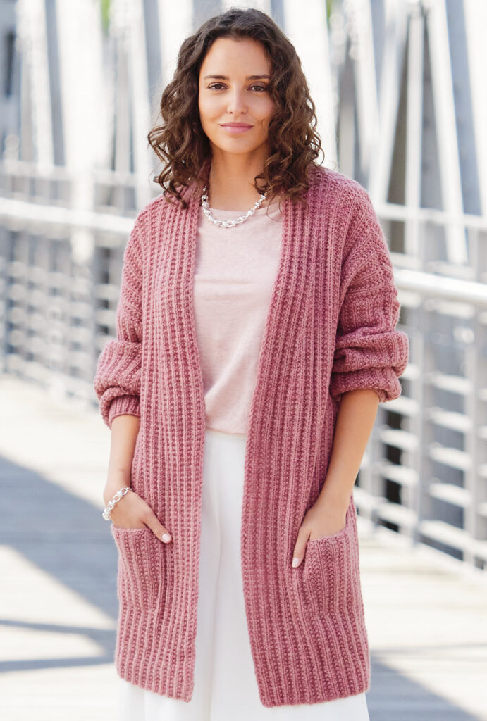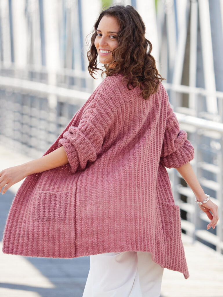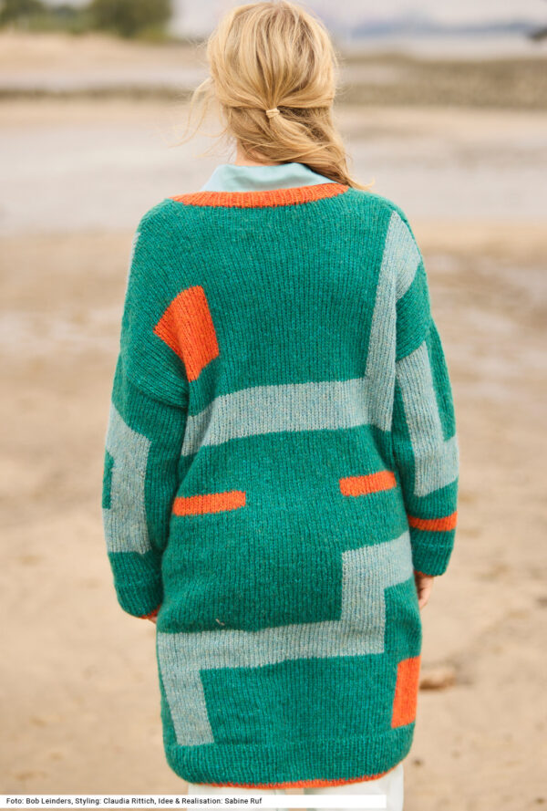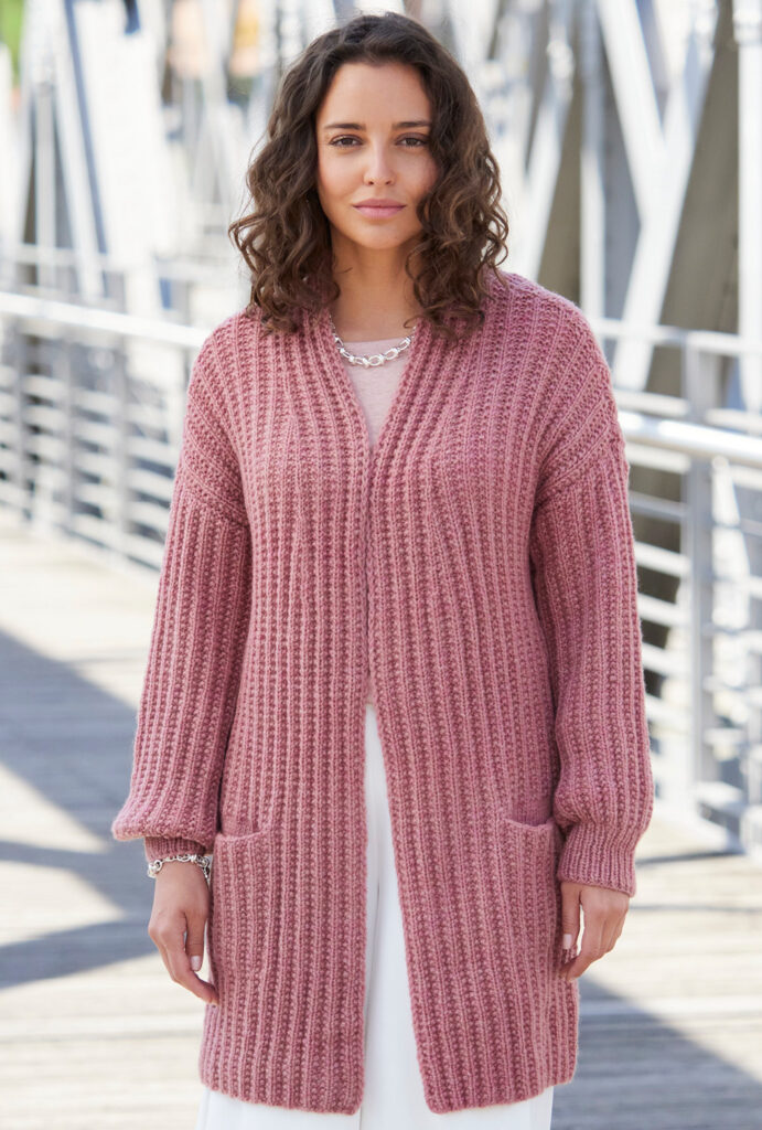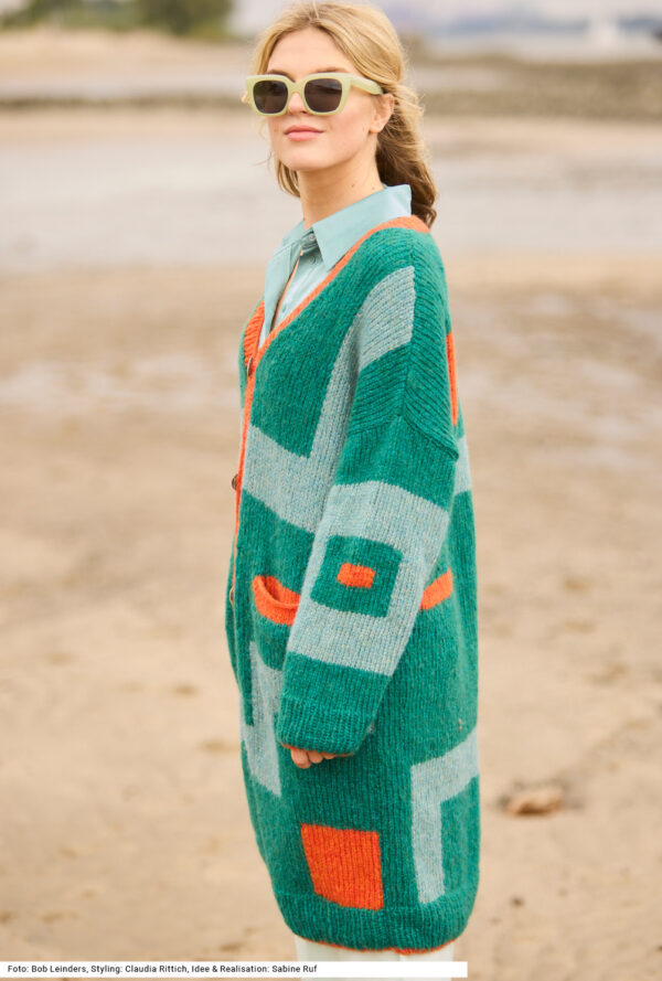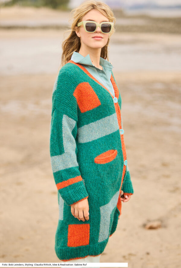 Mit kurzen Strickmänteln geht’s schwungvoll in den Winter. Dieser besteht aus Rippenstrukturen, der Schnitt samt Kragenblende ist perfekt gestaltet und eingearbeitete Taschen gibt es auch noch – was will man mehr! Gerade Teile mit Schulter- und V-Ausschnittschrägung machen das Zusammennähen einfach, wird doch die Reversblende gleich mitgestrickt. Unkompliziert ist auch das Reliefmuster, nur aus rechten und linken Maschen, und die unterlegten Taschenbeutel in glatt rechts. Ein weiches Garn aus Schurwolle und Kamel mit einer langen Lauflänge (mit 6er-Nadeln gestrickt) machen diesen rosenholzfarbenen Mantel zum Leichtgewicht. Eine Anleitung steht für die Größen 38/40, 42/44 und 46/48 zur Verfügung.