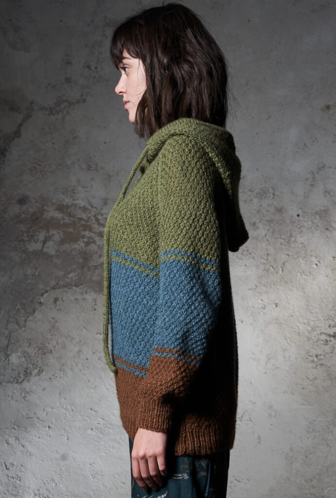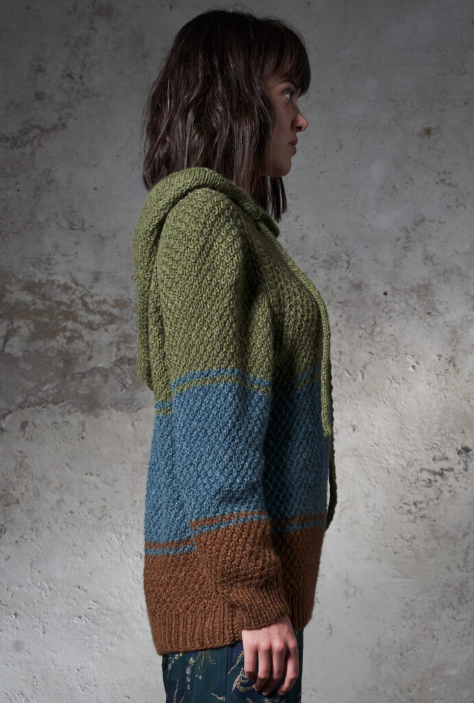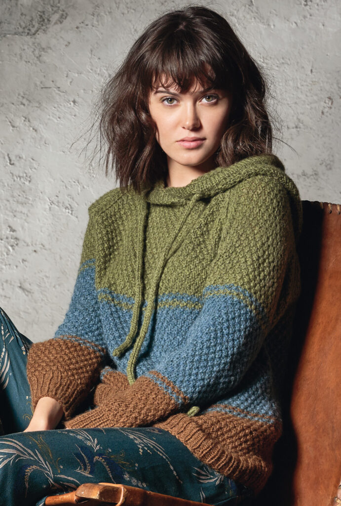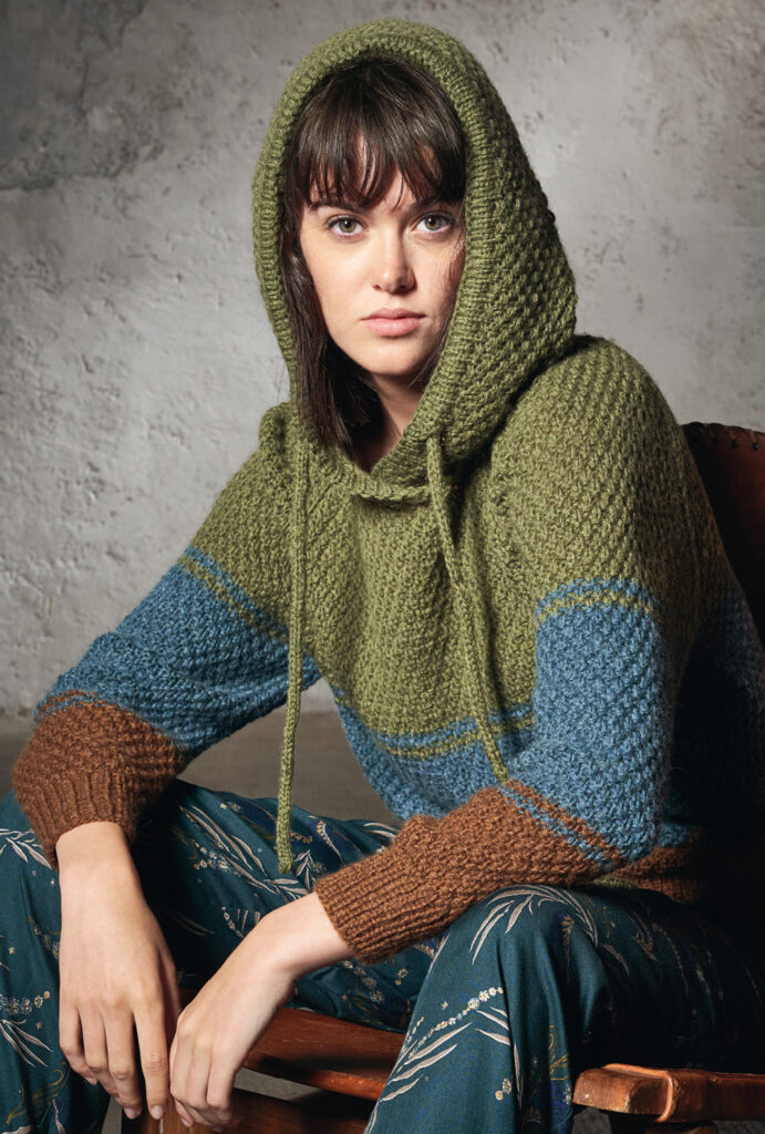Wir feiern die Hoodie-Saison das ganze Jahr! Denn kaum ein anderes Kleidungsstück kann sowohl lässig, leger oder auch sportiv und modern interpretiert werden, ist so unkompliziert und vielseitig. Dieser lässige Kapuzen-Pulli punktet mit seinem plastischen Perlmuster und dem geschickten Zusammenspiel von Cognac, Petrol und Oliv. Gestrickt wird in Einzelteilen: erst das Rippenbündchen, dann weiter im Perlmuster. Mit Nadelstärke 6 und dem angenehm über die Nadeln gleitendem Garn aus Schurwolle und Kamel geht es schnell voran. Das große Perlmuster bietet dabei Abwechslung, ist aber unkompliziert zu stricken. Sind Vorderteil, Rückenteil, Ärmel und Kapuze dann geschafft, geht es auch schon an die Ausarbeitung. Die Raglannähte werden geschlossen, die Kapuze bekommt ihren Tunnelzug und wird an den Halsausschnitt genäht, dann werden die restlichen Nähte geschlossen. Und schon können wir ihn anziehen – ganz lässig im Street-Style, als gekonnten Bruch zum femininen Flatterrock oder ganz schlicht zur Jeans.