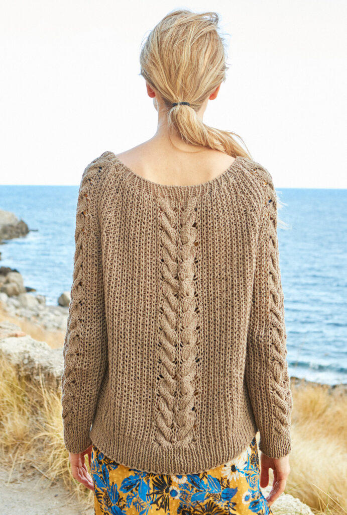Sehr lässig zeigt sich der Raglanpullover mit seinem legeren Schnitt, den plastischen Rippen und einem effektvollem Zopfstreifen in der Mitte. Mit Nadelstärke 7 gestrickt, braucht es auch nicht sonderlich viel Geduld, bis der neue Lieblingspulli fertig ist. Gestrickt wird der Raglanpulli in einzelnen Teilen von unten nach oben. Sowohl Rückenteil, Vorderteil und die Ärmel beginnen erst einmal mit einem Rippenbündchen. Danach werden die Maschen für die Rippen im Halbpatent-Muster und den Zopfstreifen eingeteilt. Besonders zu Beginn sind hierbei Maschenmarkierer sehr praktisch, um die einzelnen Musterabschnitte zu kennzeichnen. Dann geht es immer in der Mustereinteilung weiter hoch, die Raglanschrägungen werden später noch zusätzlich mit betonten Abnahmen gearbeitet. Beide Muster sind in der Anleitung Reihe für Reihe erklärt, wobei der Zopfstreifen seine besondere Optik durch geschickt platzierte Umschläge erhält. Sind alle Teile fertig, werden die Nähte geschlossen und aus dem Halsausschnitt das Rippenbündchen herausgestrickt.