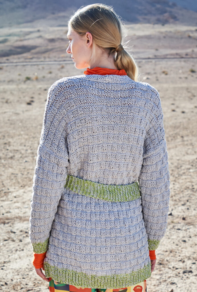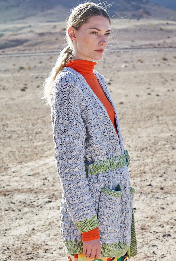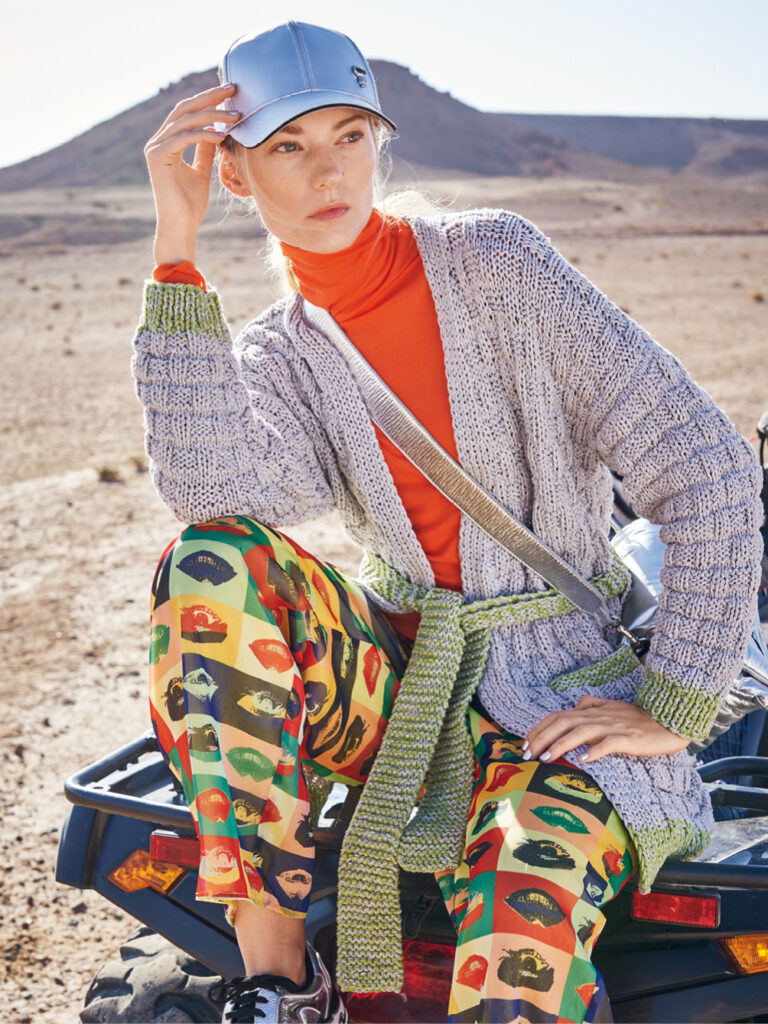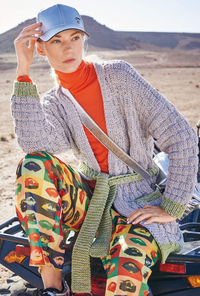 So geht chic und zugleich sportiv! Das metallisierte Baumwollgarn dieser lässigen Strukturmusterjacke setzt edle silberne Glanzlichter und wird mit Blenden und dem Gürtel in Pistaziengrün effektvoll kombiniert. Gestrickt wird der Cardigan mit zwei Fäden gleichzeitig und Nadelstärke 7 – so geht es schnell voran. Jedes Teil beginnt mit dem Rippenbündchen, dann folgt das unkomplizierte Strukturmuster. Besonders praktisch: Die Vorderteilblenden werden gleich mitgestrickt. Sind das Rückenteil, die beiden Vorderteile und Ärmel fertig, werden noch die Taschen und der Bindegürtel gestrickt. Die Taschen werden dann so auf die Vorderteile genäht, dass das schöne Strukturmuster auch über diese fortläuft und nicht unterbrochen wird. Dann die Schulternähte schließen, die Blende zusammennähen und in den rückwertigen Halsausschnitt nähen. Dann nur noch die Ärmel einsetzen und die restlichen Nähte schließen.