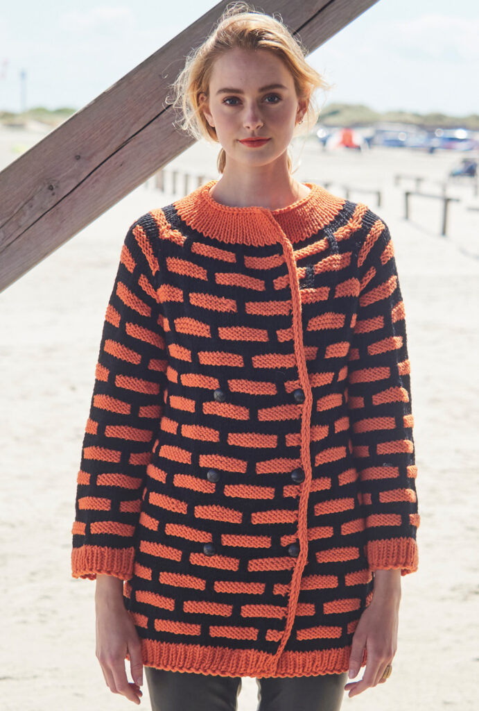Orange ist gerade DIE angesagte Farbe. Wir haben sie mit in einem Muster aus orangenen Kraus-rechts-Streifen mit schwarzen Glatt-rechts-Streifen kombiniert, bei dem der Korbflechteffekt mit Höhen und Tiefen sehr deutlich auffällt. Alle Bündchen und die Halsausschnittblende sind in Rippen gestrickt, wobei der Anschlag als Kreuzanschlag gearbeitet wird und auch die Abkettreihe der Halsausschnittblende diesem Anschlag nachempfunden wird. Ein I-Cord-Rand ziert die Vorderteilkanten. Die Vorderteile werden mit einer doppelten Reihe mit Lederknöpfen geschlossen. Dazu die passende Clutch im gleichen Muster. Die Anleitung steht zum Download bereit für die Größen 38 – 42 und 44 – 48, Tasche: 26 x 41 cm