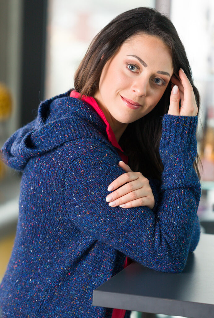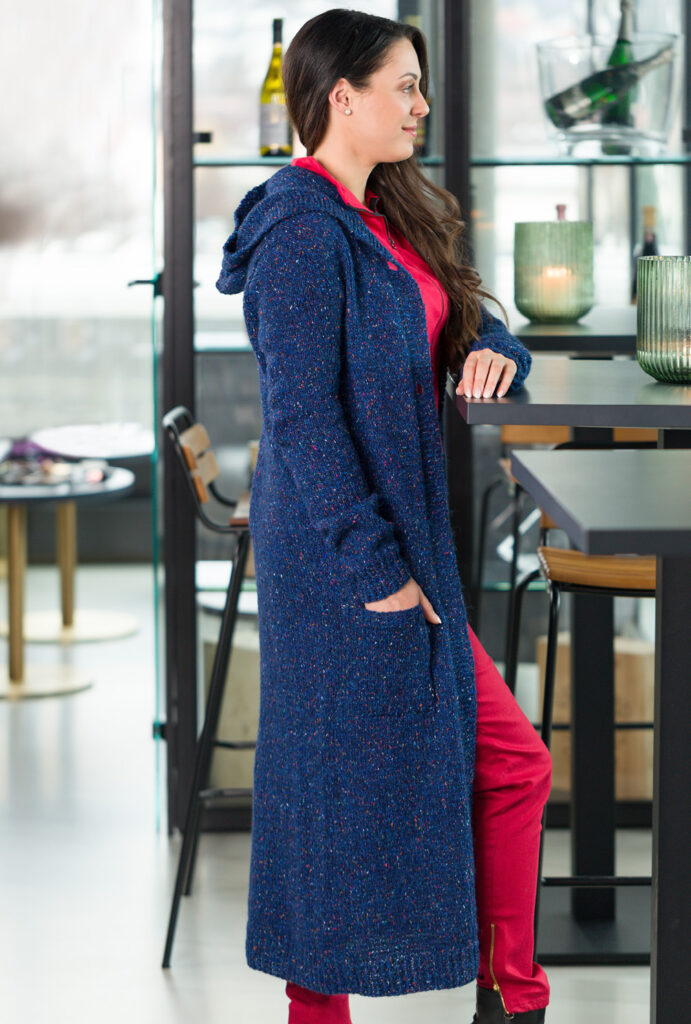 Dank des weichen, voluminösen Dochtgarns bleibt der dunkelblaue Strickmantel trotz großzügiger Länge zwischen Midi und Maxi recht leicht und durch den Elastan-Anteil langfristig formstabil und schön. Als Grundmuster glatt rechts gestrickt, bekommt der Mantel eine kraus rechts gearbeitete Knopfblende, deren Knopflöcher nur im oberen Bereich bis zur Taille vorkommen. Praktisch sind die aufgesetzten Taschen und die coole Kapuze – in beidem kann man Kopf und Hände, wenn es beim Spaziergang mal kühler wird, verstauen.. Eine Anleitung steht für die Größen 36/38, 40/42, 44/46, 48/50 und 52/54 zur Verfügung.