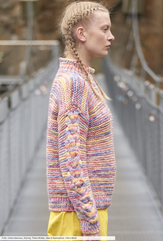 Der Style von Chunky Knit ist alles, nur nicht zurückhaltend. Das beweist auch dieser Pulli, dessen bunt meliertes Garn aus reiner Schwurwolle im Mittelpunkt steht. Wir haben auf schwierige Muster und raffinierte Schnittdetails verzichtet und lassen einfache Kraus-rechts-Rippen zum Einsatz kommen. Nur auf der Ärmelmitte setzt sich ein plastischer Zopf gekonnt in Szene, den wir in unserer Anleitung genau beschrieben haben.